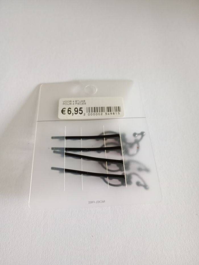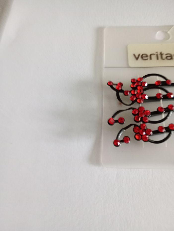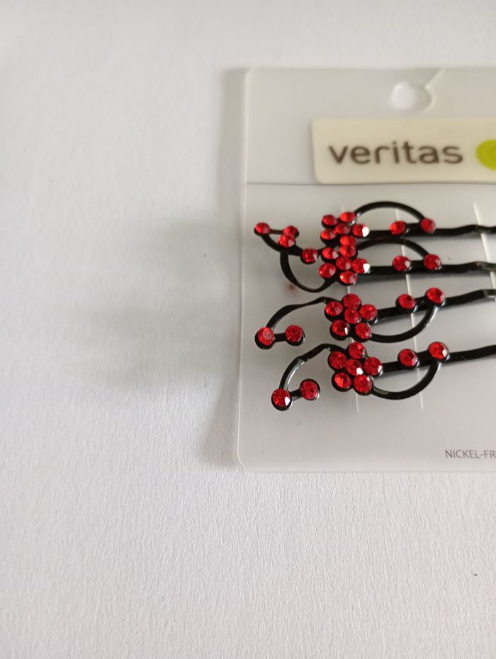 3 attaches pour cheveux avec strass rouges. Le métal est malléable sur le bord, ce qui fait que c'est un peu tordu. Marque : Véritas Très bon état.