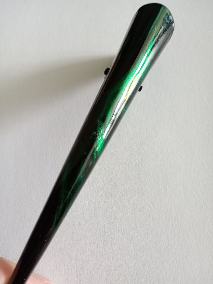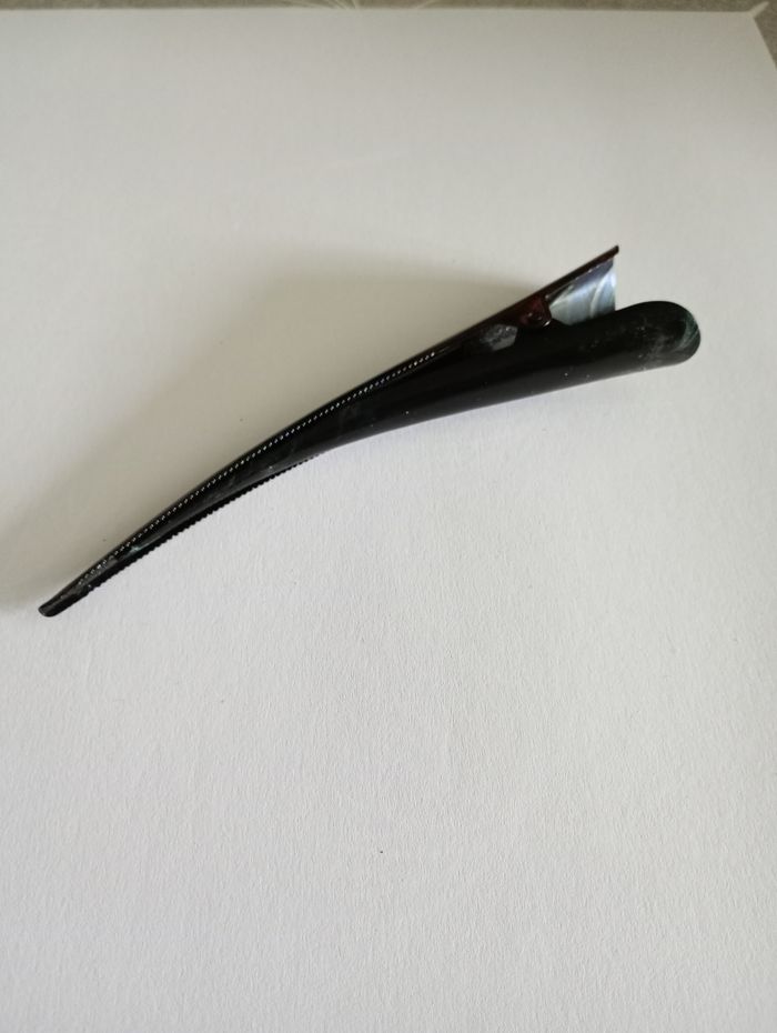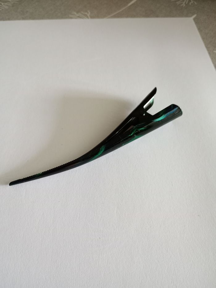 Pince en métal pour cheveux, noire avec effet vert marbré. Longueur : 13 cm. Très bon état.