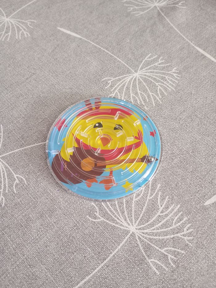 Jeu avec bille à faire tourner dans un labyrinthe. Diamètre : 7 cm. Très bon état