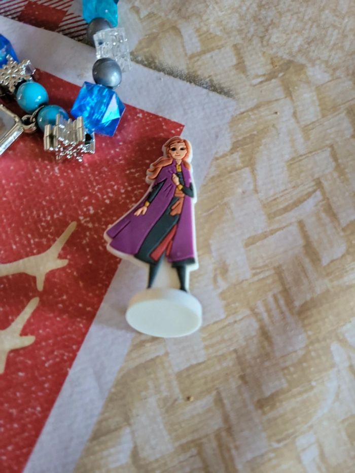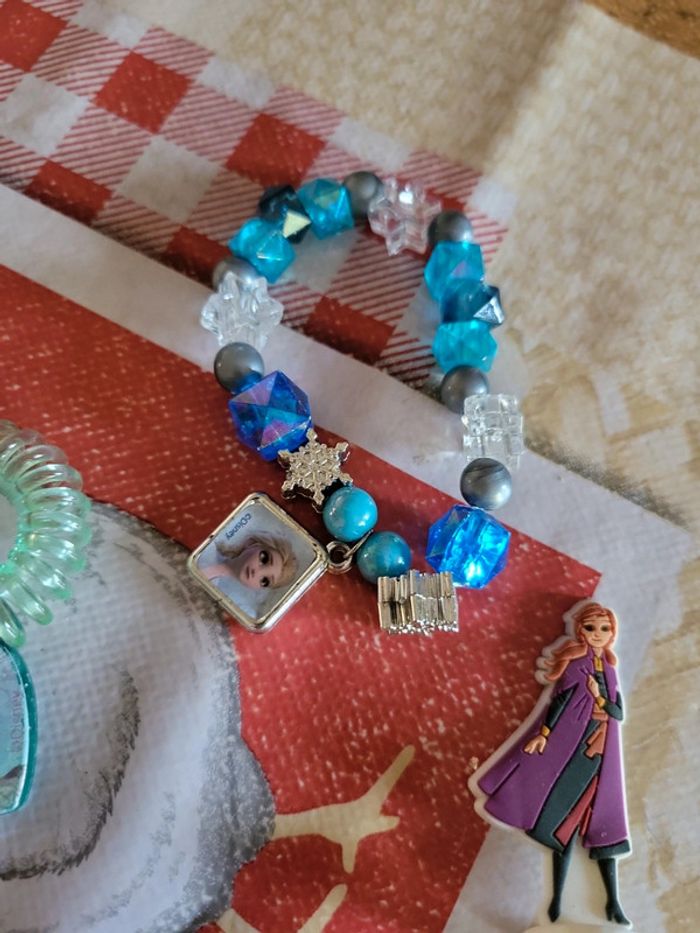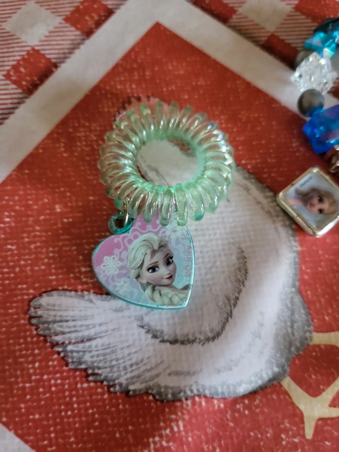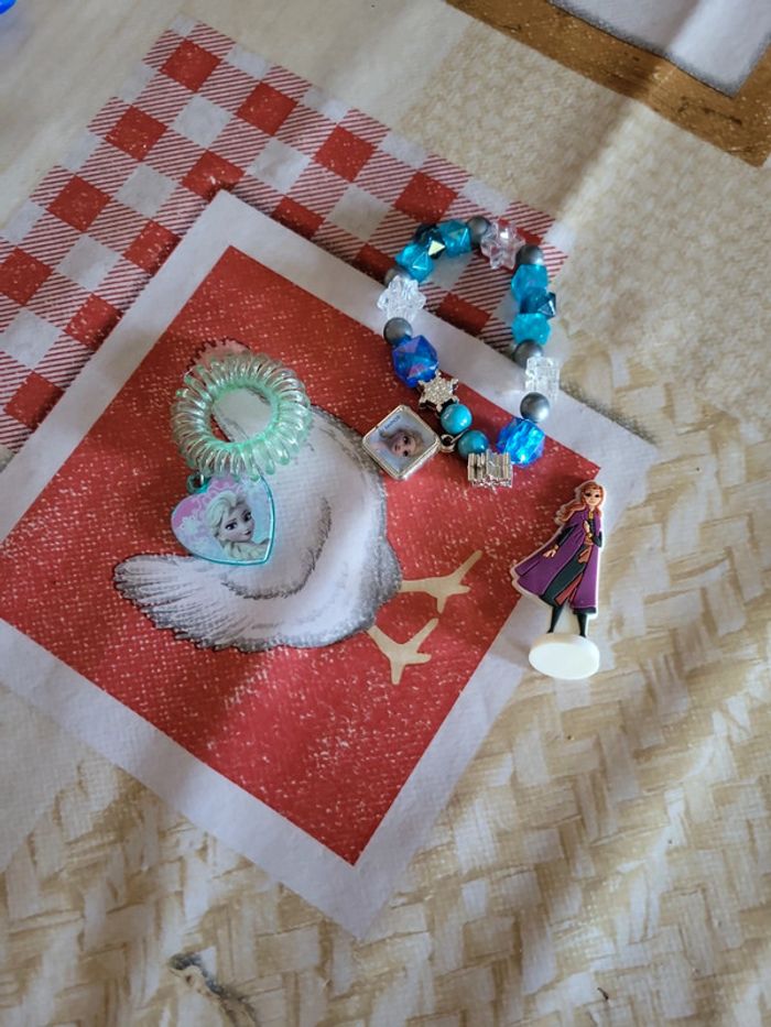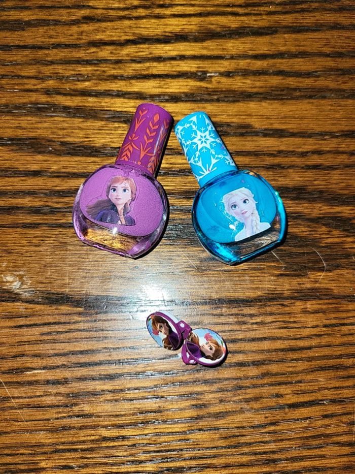 Lot bijoux reine des neiges 1 bracelet 1 élastique 1 petite figurine Anna offerte avec 2 vernis un peu utilisé 1 paire de boucles d'oreille ana Très bon état