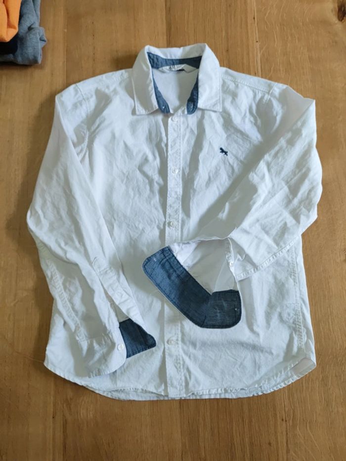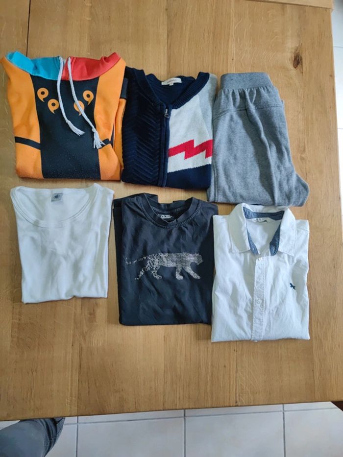 Vends lot de 6 vêtements enfant Taille 6 ans État : bon et très bon Composé : -tshit manches courtes Petit Bateau blanc en parfait état -tshit manches courtes Airness noir en bon état -chemise manches longues H&H blanche en parfait état - sweat manches longues Naruto en bon état(peluche) - gilet manches longues Catimini neuf jamais porté - jogging gris Decathlon bon état (tâche fesse droite) Lot dissociable