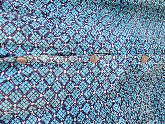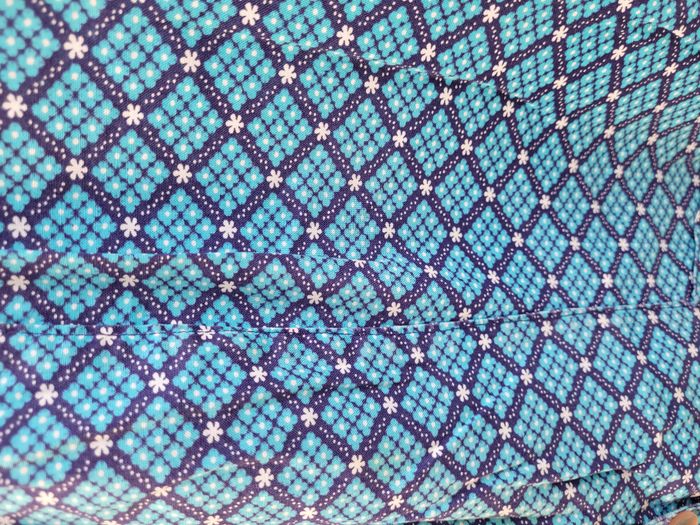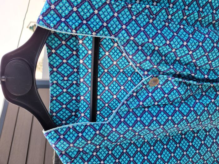 années 70 en coton motif : losange de fleurs bleues turquoise encadré de chemin de fleurs blanches sur fond bleu marine boutonnage sur le devant 2 poches hauteur 97 cm largeur poitrine 56 cm