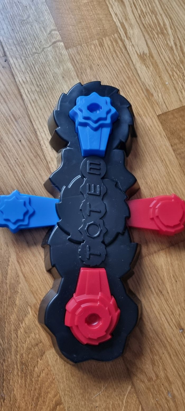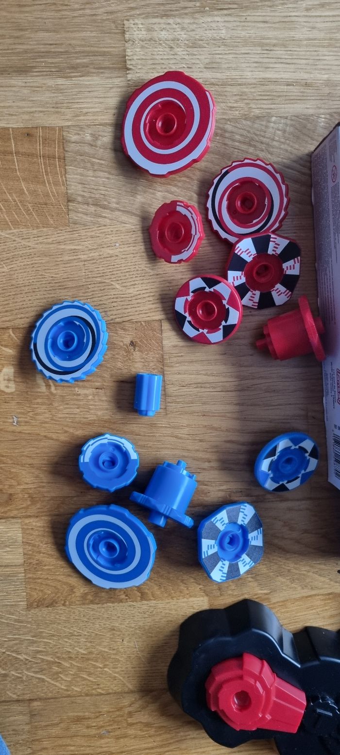 Jeu de toupies, très peu utilisé. Il manque juste 3 petits supports pour augmenter la difficulté (dernière photo) mais ça ne gêne en rien l'utilisation
