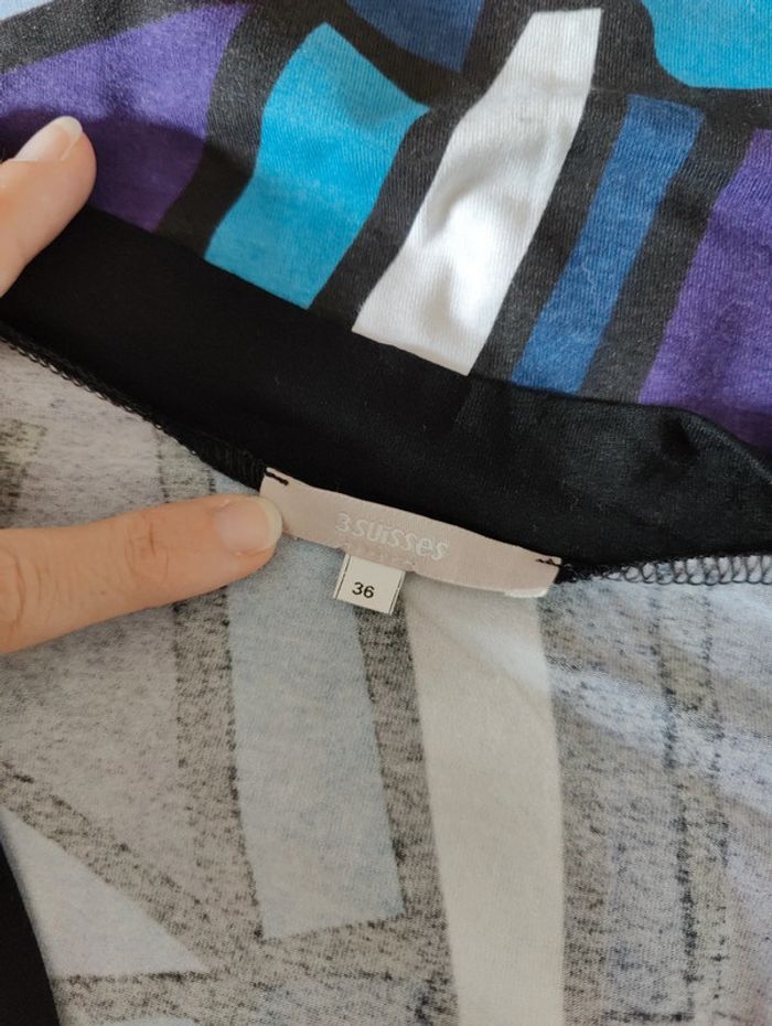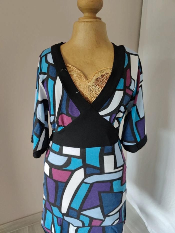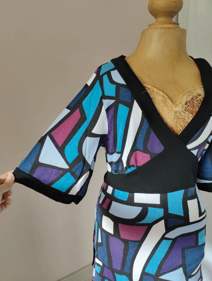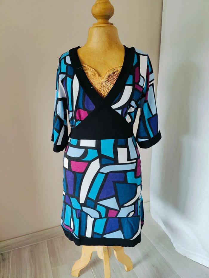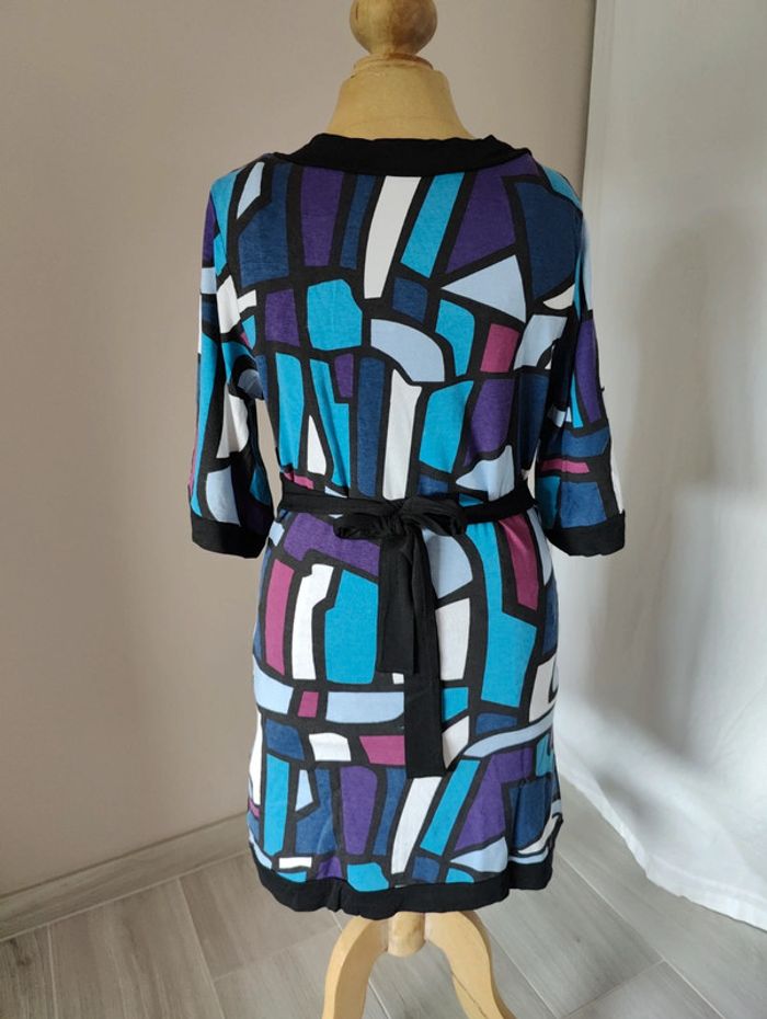 Tunique à motifs géométriques multicolores. Liens à nouer dans le dos pour resserrer la taille. 3 suisses, taille 36