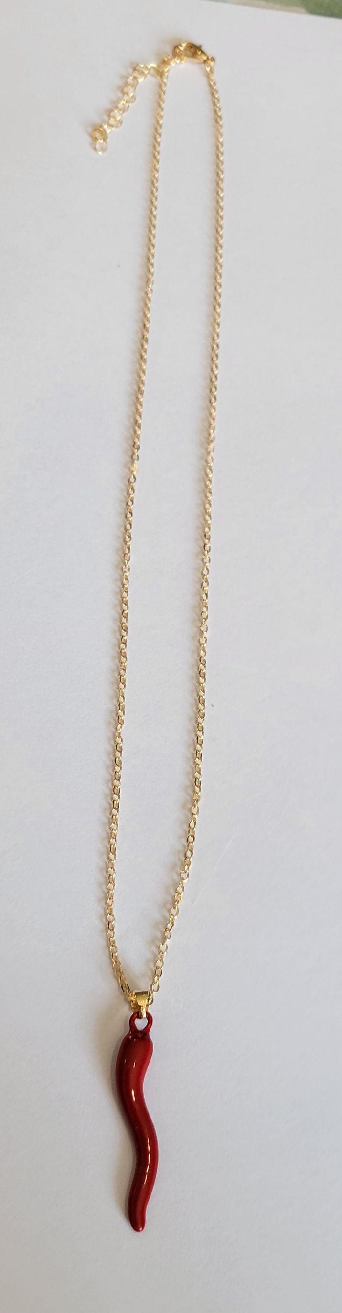 COLLIER PIMENT ROUGE ! NEUF ! Chaine coloris doré : Longueur : 45 cms . Hauteur du pendentif piment rouge: 3 ,2 cms. Collier neuf sous blister. Envoi soigné et rapide.