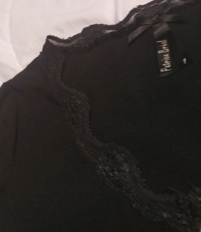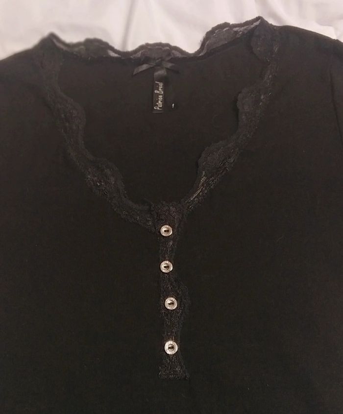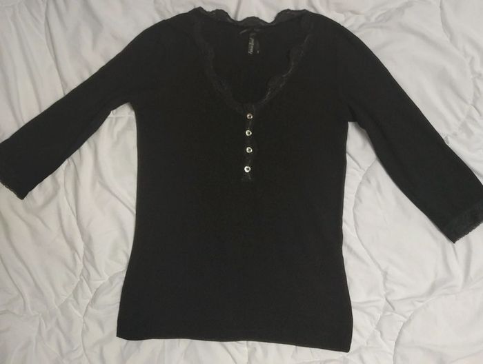 T-shirt manche 3/4 avec dentelle au col et aux manches. Longueur manche en partant des épaules 41 cm. longueur t-shirt en partant de l'épaule 60 cm.