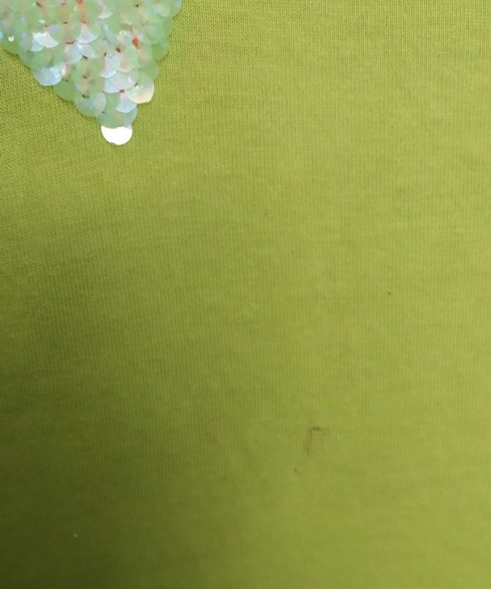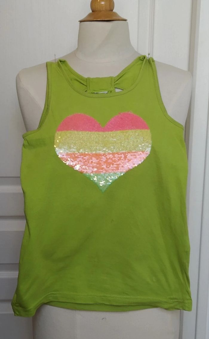 Débardeur femme couleur vert avec cœur en paillettes, longueur 46 cm, largeur poitrine 35 cm conviendrait pour une jeune fille attention petit défaut sur le devant voir photos.
