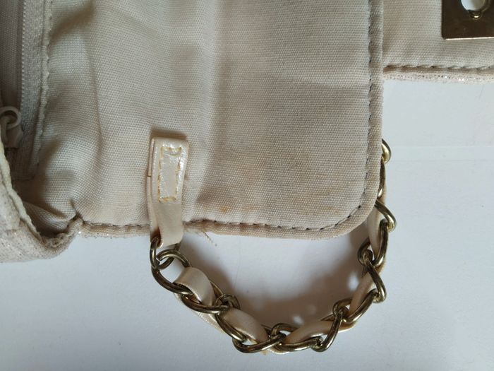 Petit sac à main doré avec chaîne bandoulière de 60 cm. 1 poche intérieure. Attention légère decolaration à l intérieur du rabat. Voir photo