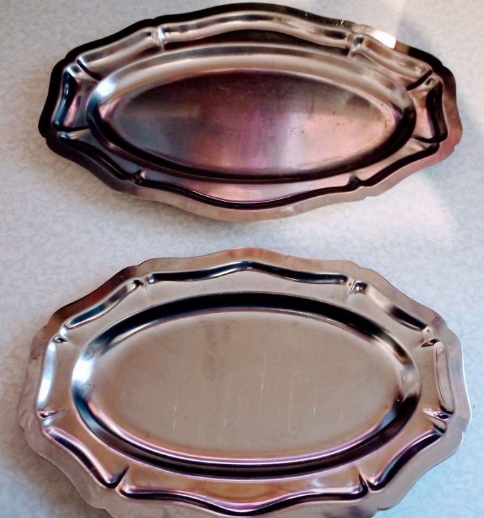 2 plateaux inox de services ovale de diamètres 30cm et 35cm.