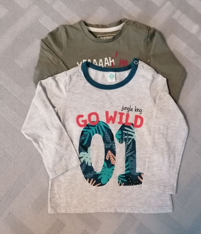 Lots de 3 T. Shirts Manche longue garçon. 1)vert kaki :18mois /86cm Inextenso.100%coton 2) gris 23mois, tex baby, 100%coton 3) bleu 23mois. Kimadi, 100%coton. Porté. Le lots : 6€