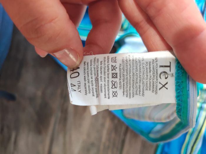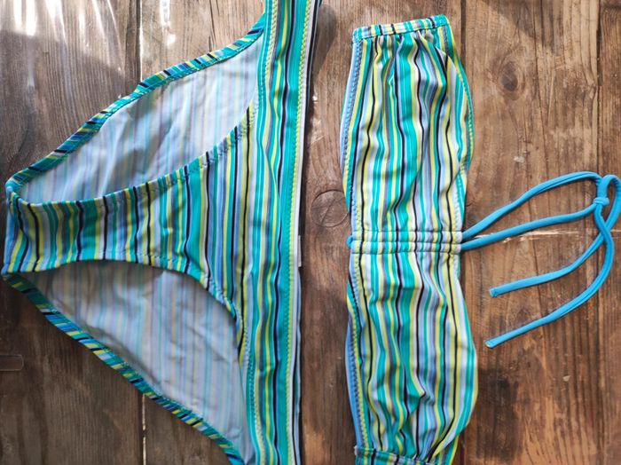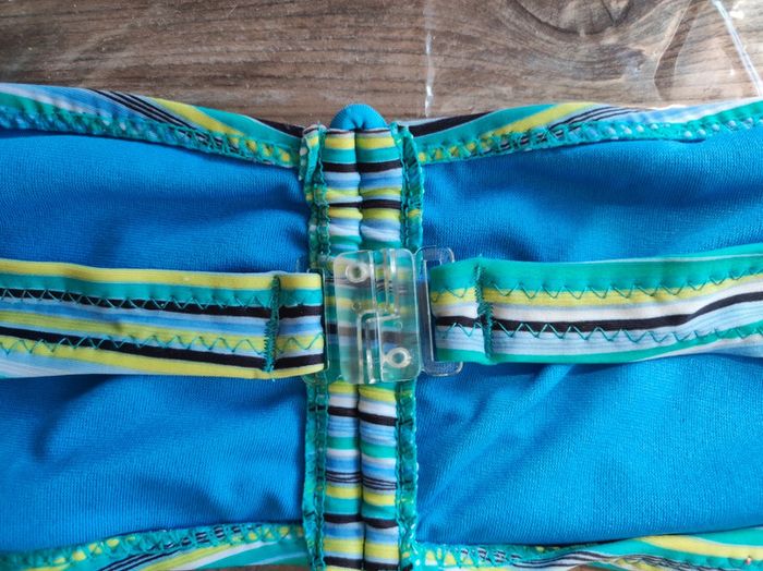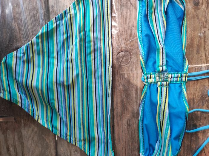 Je vends ce bikini bleu/jaune/noir réglable sur la nuque du haut de maillot mais pas le dos, et le bas non réglable de chez Tex