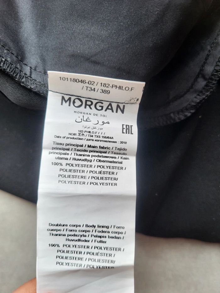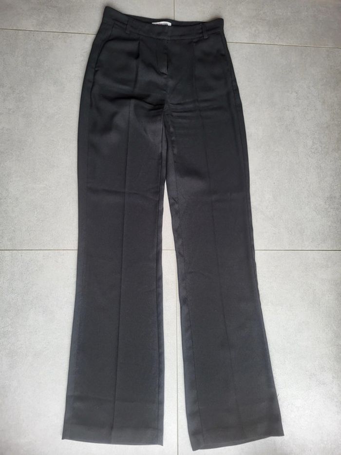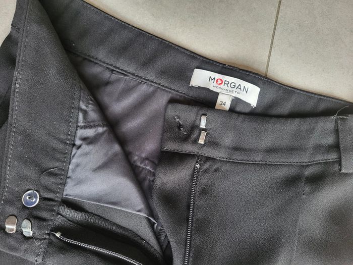Pantalon noir à pince, coupe droite avec poches sur le côté. Fausses poches à l'arrière. Très classe, parfait pour des rdv professionnels par exemple. Porté très peu de fois (2-3) mais je l'adore. Je le vends car mon bassin s'est élargi suite à une grossesse. Taille 34 mais convient à du 36 (Morgan taille grand)