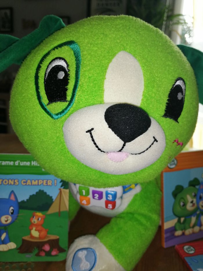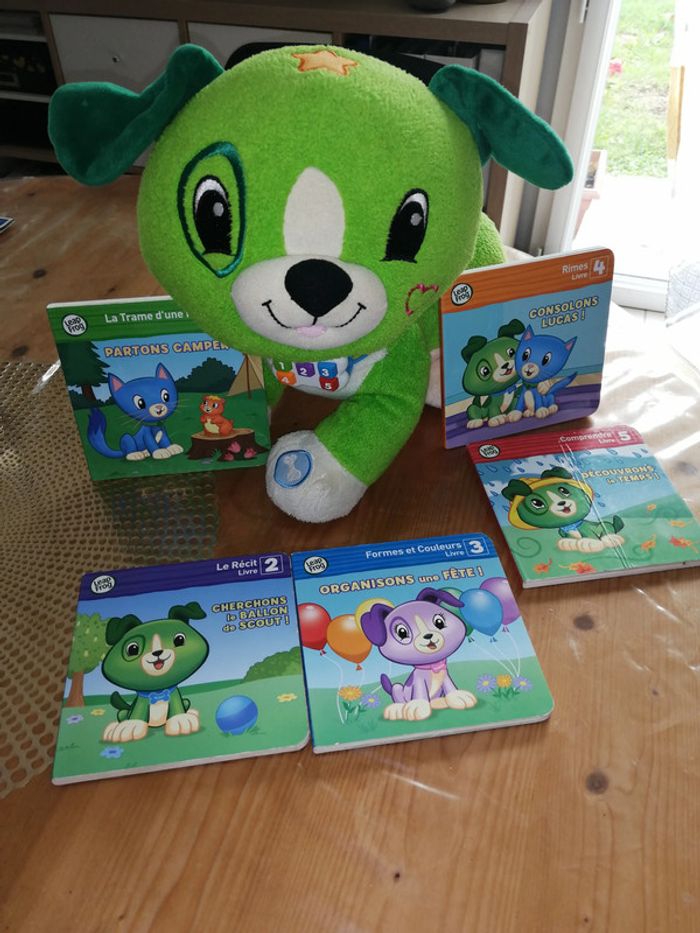 #nad_35_livres #nad_35_jeux_jouets Lis avec Scout + 5 petits livres vert Une peluche vraiment sympa, mes enfants ont adoré être accompagné de Scout pour leur coucher. Un petit compagnon idéal pour préparer le coucher. Vendu sans les piles Peluche en très bon état. La couverture du livre 5 a cependant été plié.