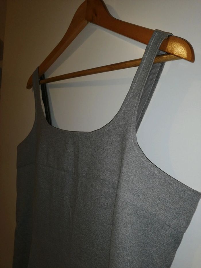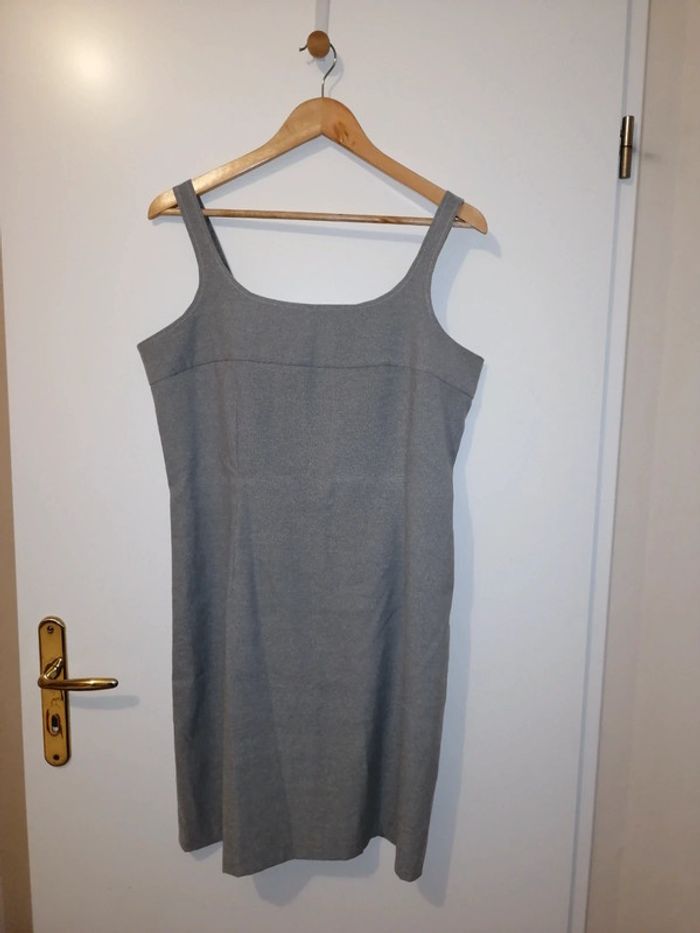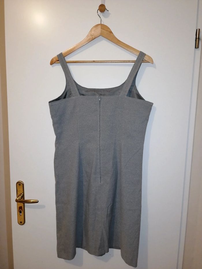 #nad_35_femme_42 Robe de tailleur avec doublure Etam Il n'y a plus l'étiquette de la matière Matière douce au toucher en tout cas Dimensions : Taille 47 cm au niveau de la poitrine Longueur haut bretelles jusqu'au bas de la robe 92 cm Gris Très bon état