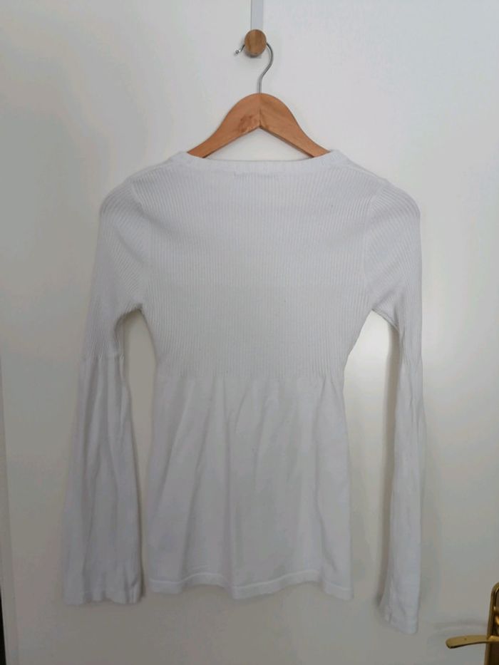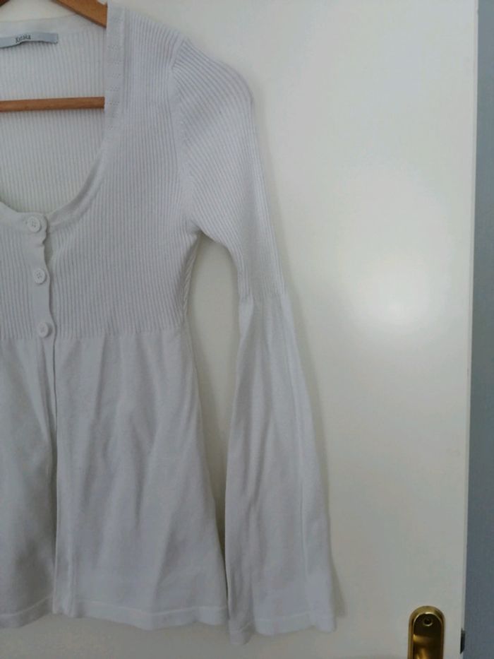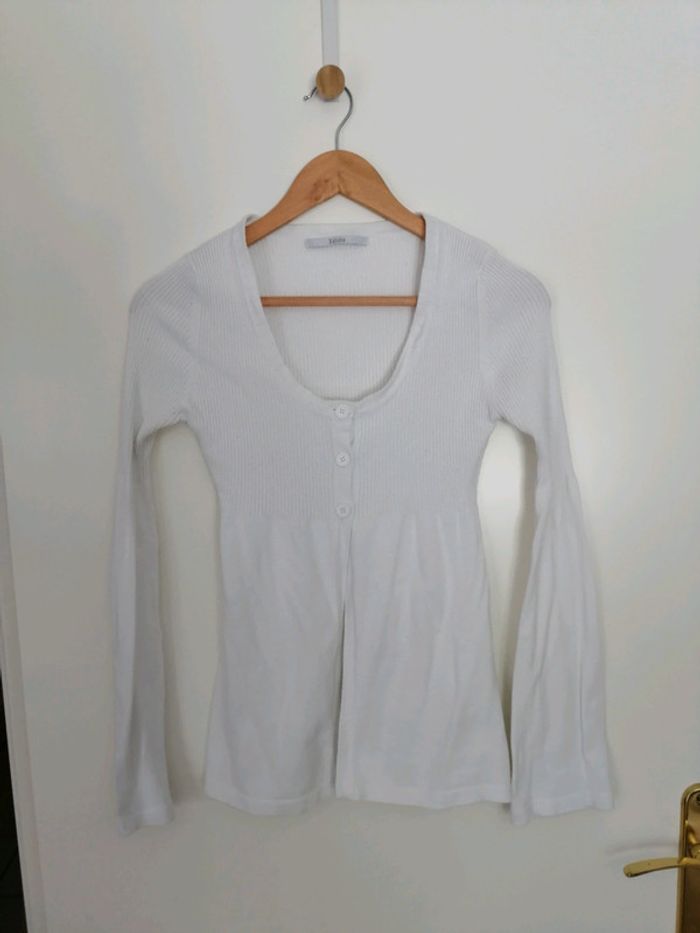 #nad_35_femme_38. Taille M Gilet blanc de la marque Xanaka Manches effet patte d'éléphant Taille M Matière : 75% viscose 25% polyamide Très bon état peu porté.
