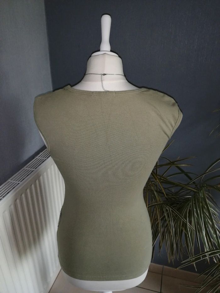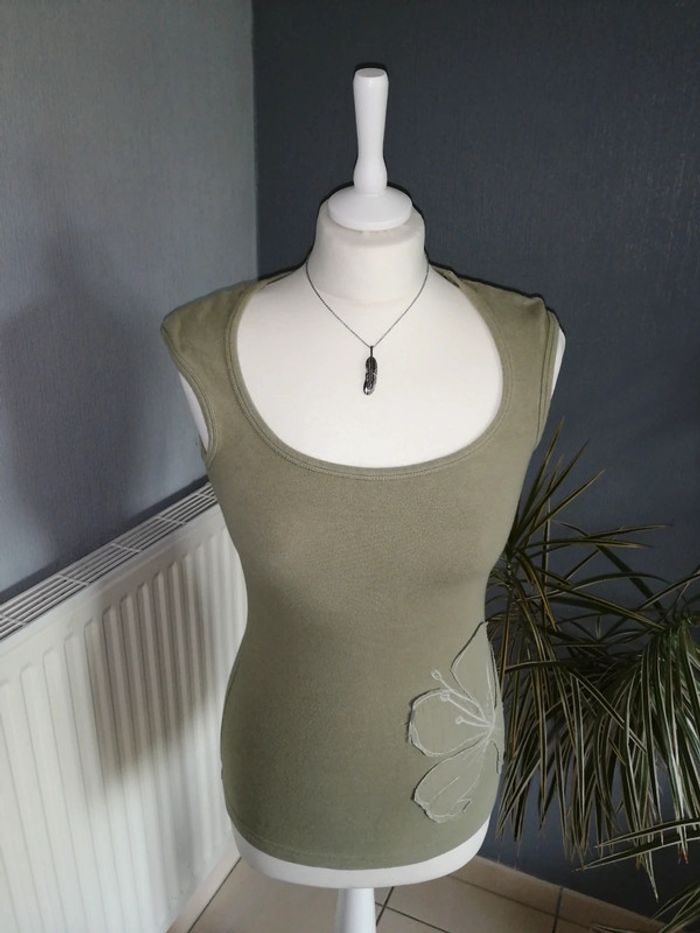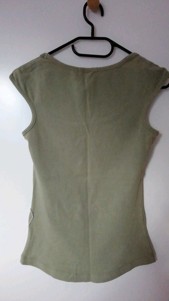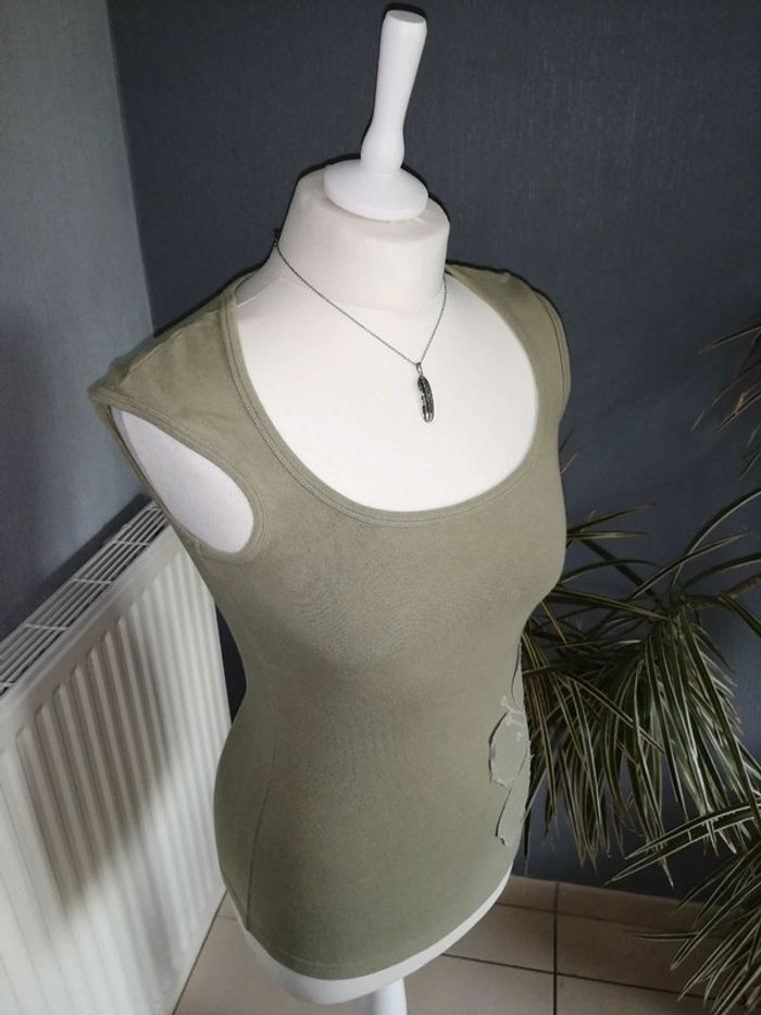 #nad_35_femme_38. Taille M Haut moulant de la marque Roxy Couleur Kaki clair Tissu assez épais Taille L mais taille petit M Matière : 92% coton / 8% elasthane Dimensions : Épaules 24 cm Longueur 56 cm Jamais porté car trop petit 😏 Très bon état ⚠️ Vendu sans le collier