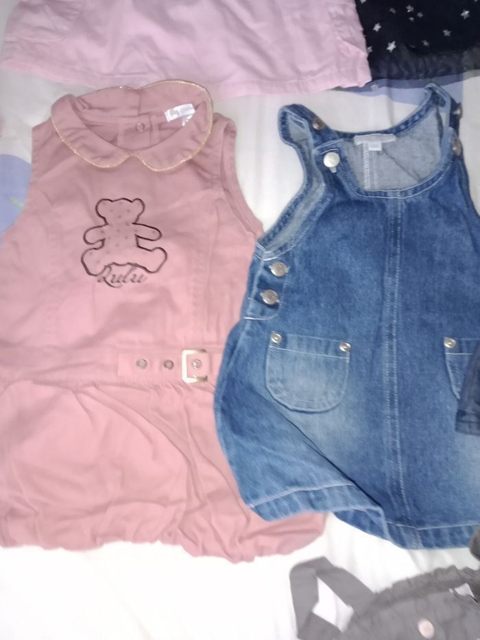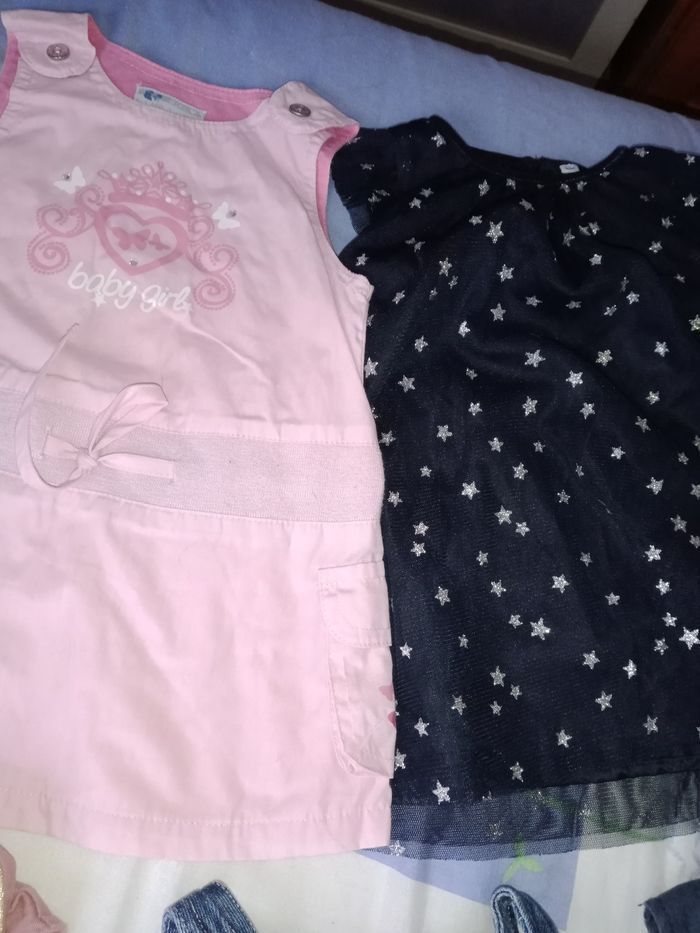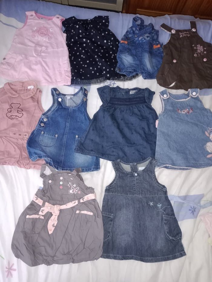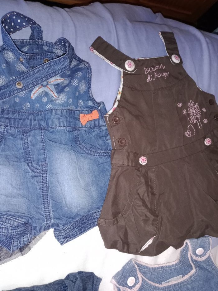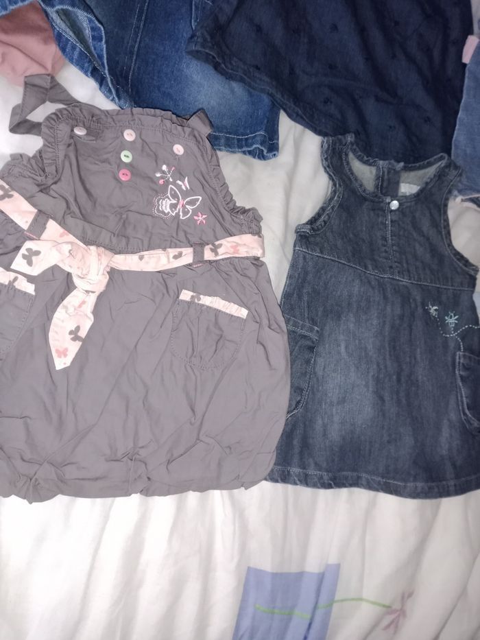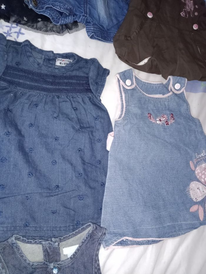 Robe 6 mois TBE 4€ pièce . Rose Baby girlkimbaloo bon état . Bleu marine avec étoiles . Salopette courte Baby orchestra . Robe marron bisous d'ange . Rose Lulu castagnette . En jean's fine bretelle kimbaloo . Couleur jean barbouillage avec petites fleurs . En jean's avec bord rose et fleurs kimbaloo . Grise avec boutons colorés Baby by Gémo . En jean's effet vieilli devant et derrière obaïbi.