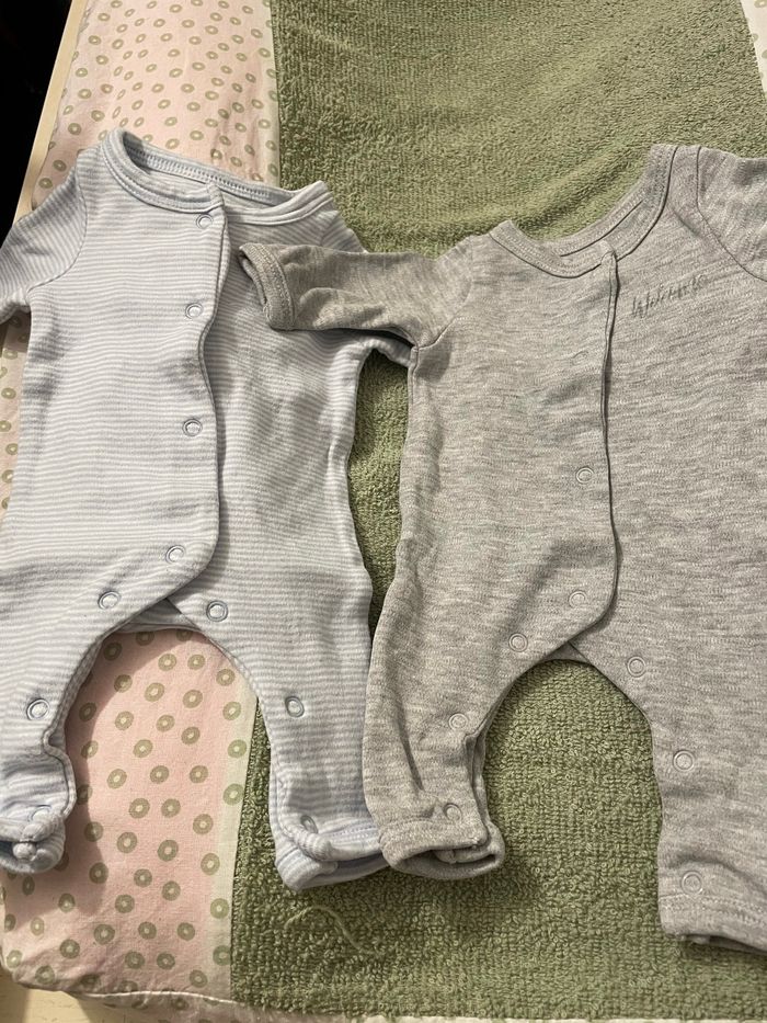 Taille naissance, bon état. Sur le gris l’écriture est partie au lavage, autrement ils ont été très peu portés (2 fois max)