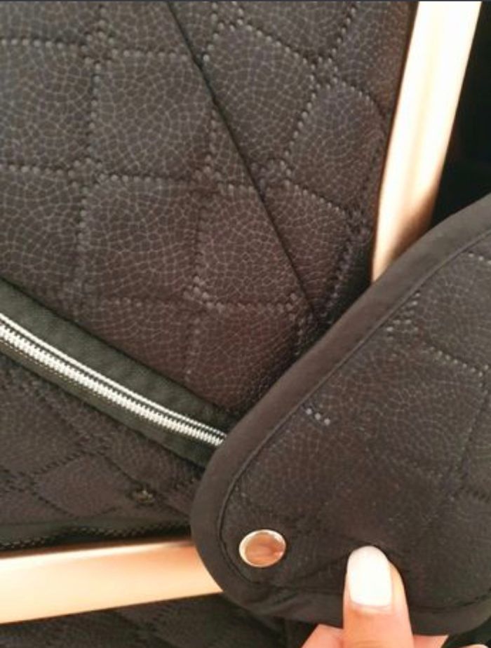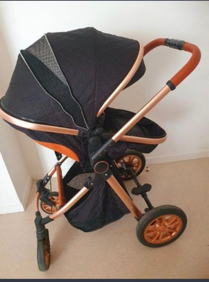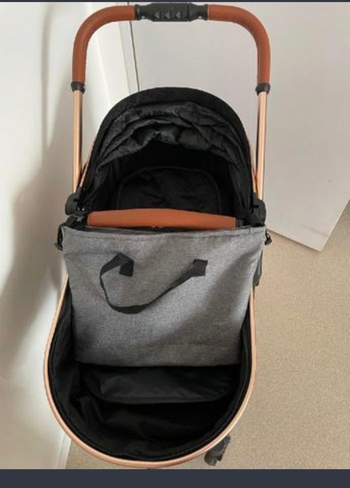 Vend très belle poussette Noir et rose gold, très pratique pour bébé dès la naissance. Attention manque un bouton sur le côté qui ne dérange en rien l'utilisation de la poussette. Sac à langer offert