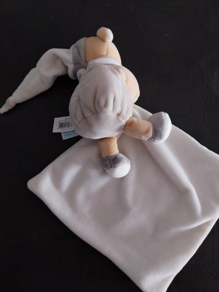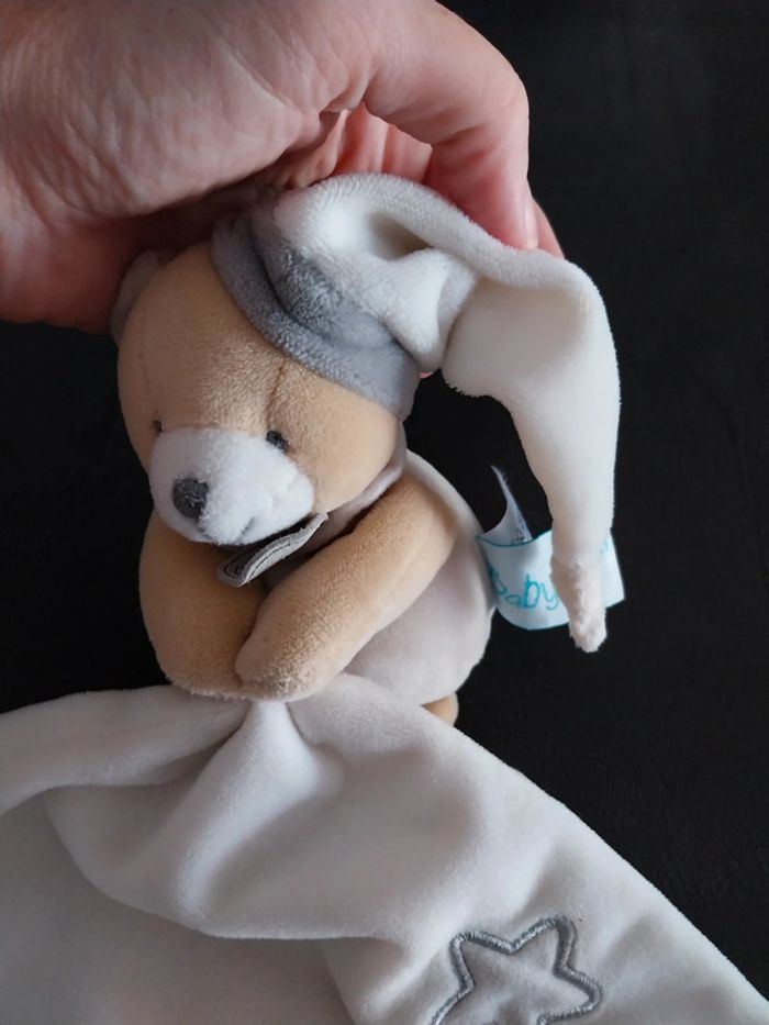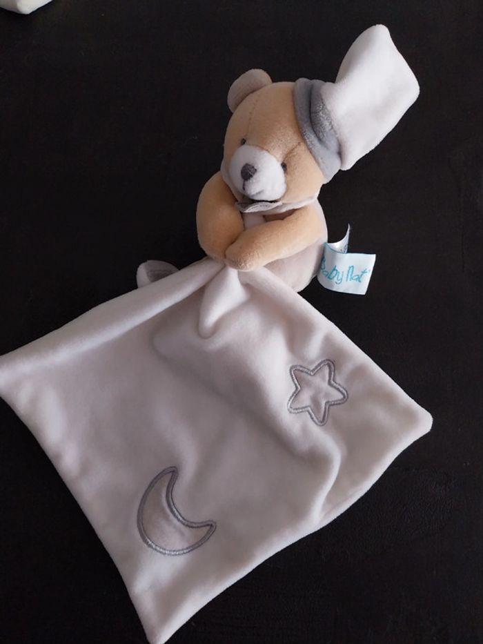 Doudou baby nat ours beige Mouchoir blanc lune et étoile brodée gris Bonnet blanc et gris Luminescent / Brille dans le noir