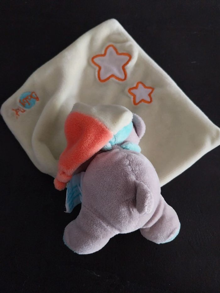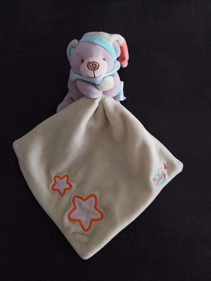 Doudou baby nat ours gris mouchoir vert etoiles brodées orange Bonnet turquoise orange vert amande Luminescent / Brille dans le noir