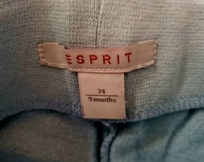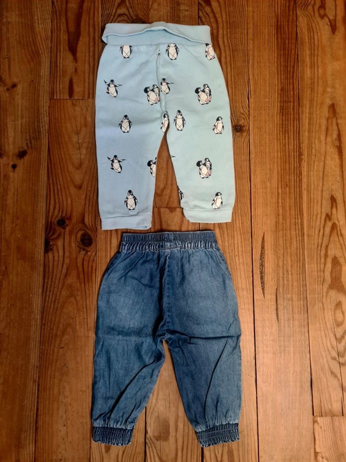 Lot de 2 pantalons pour bebe fille. L un est en jean léger de la marque lisan et l autre un bas de jogging bleu clair aux motifs petits pingouins de la marque esprit. En taille 74 cm. Tres bon état.