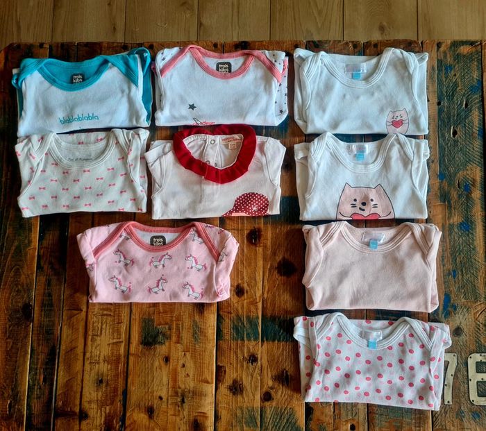 Lot de 9 bodies pour bebe fille. 5 bodies a manches longues et 4 bodies a manches courtes. Taille 9 mois. 71 cm. Differentes marques: dpam, trois kilos sept....