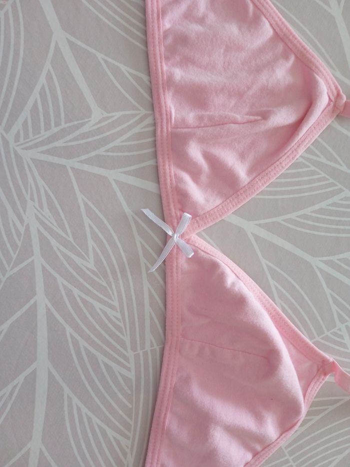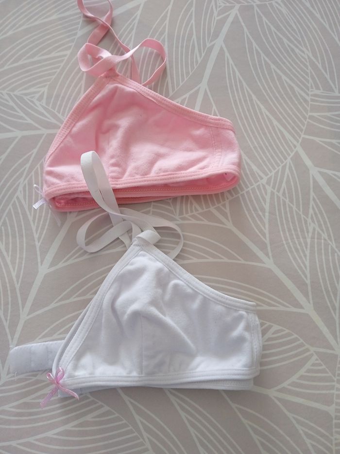 Un soutien-gorge rose et un soutien-gorge blanc. Taille 85 A. Très peu porter. Petit nœud fantaisie au niveau du creux de la poitrine. #fille12ansnade3033
