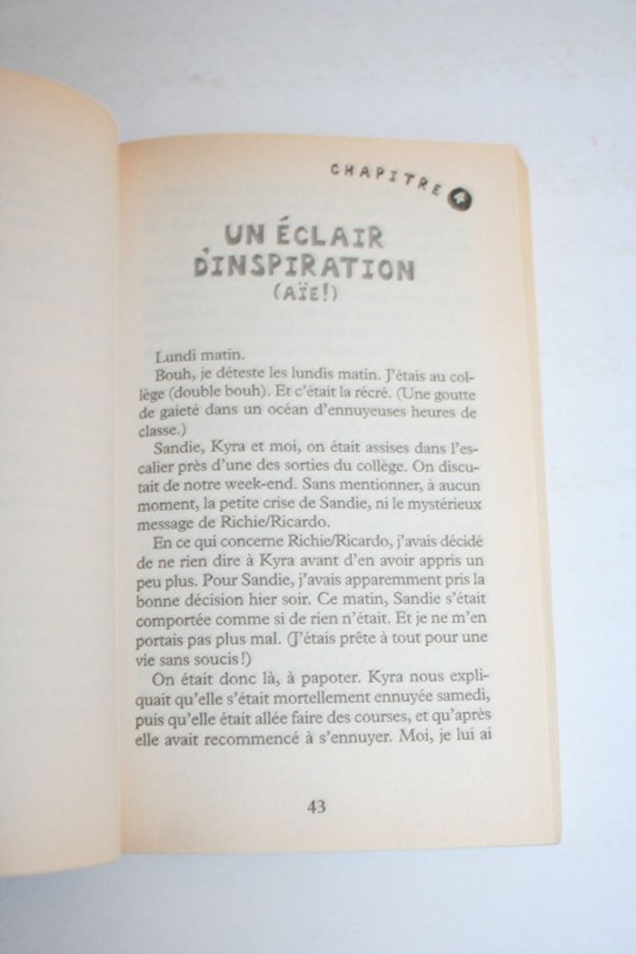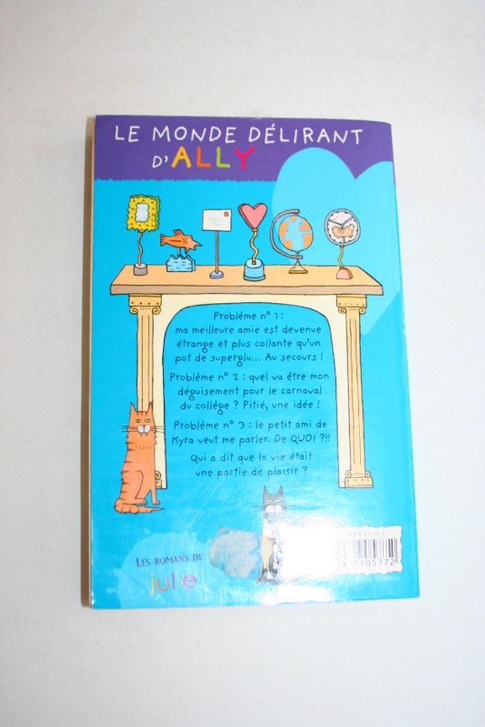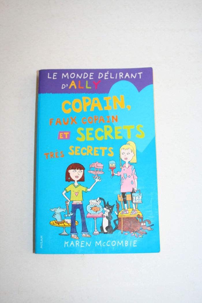 Le monde délirant d'Ally, tome 4, "Copain, Faux Copain et Secrets très secrets" de Karen MCCombie, éditions Milan, trace de l'étiquette de prix à l'arrière, 197 pages, 140g Problème n°1 : ma meilleure amie est devenue étrange et plus collante qu'un pot de superglu....Au secours ! Problème n°2 : quel va être mon déguisement pour le carnaval du collège ? Pitié, une idée ! Problème n°3 : le petit ami de Kyra veut me parler. De quoi ?!! Qui a dit que la vie était une partie de plaisir ?
