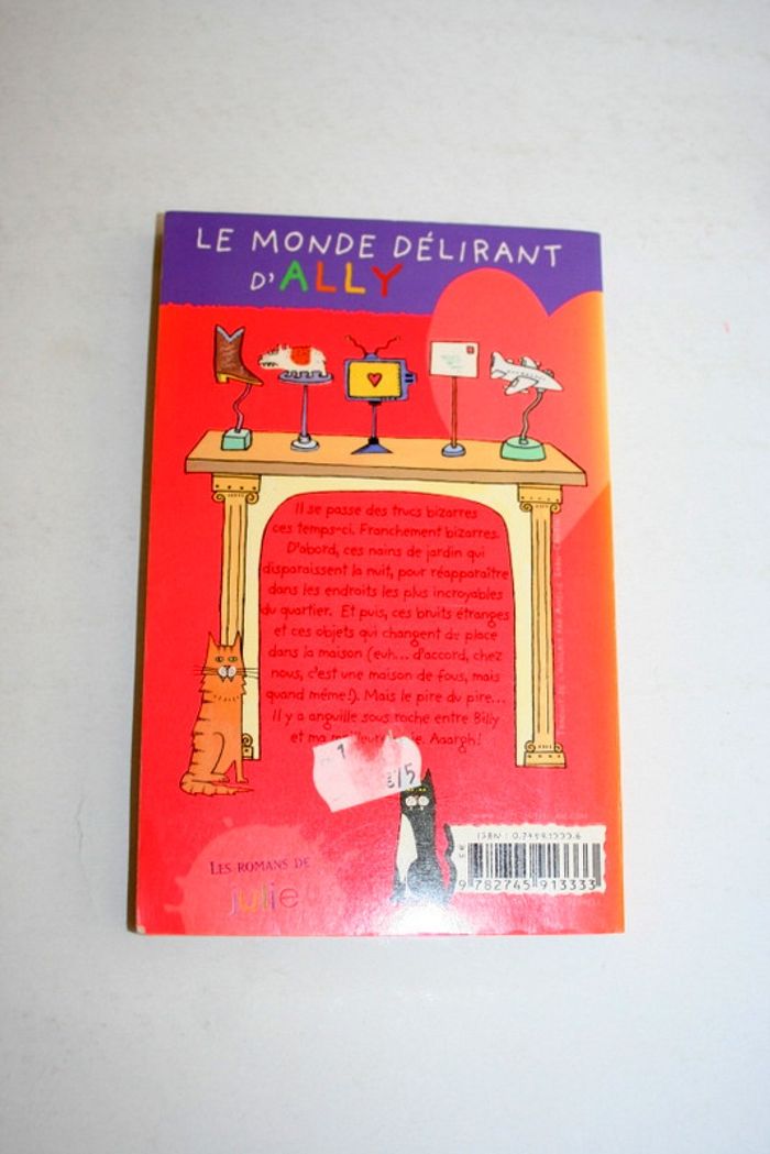 Le monde délirant d'Ally, tome 9, "Nains de jardin, téloche et grosse pétoche" de Karen MCCombie, éditions Milan, trace de l'étiquette de prix à l'arrière, 171 pages, 130g Il se passe des trucs bizarres ces temps-ci. Franchement bizarres. D'abord, ces nains de jardin qui disparaissent la nuit, pour réapparaître dans les endroits les plus incroyables du quartier. Et puis, ces bruits étranges et ces objets qui changent de place dans la maison (euh...d'accord, chez nous, c'est une maison de fous, mais quand même!). Mais de pire en pire...Il y a anguille sous roche entre Billy et ma meilleure amie. Aaargh!