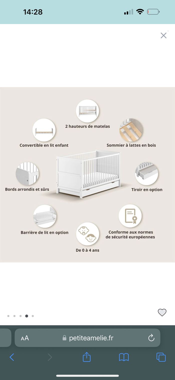 Bonjour je mets en vente c’est 3 articles pour bébé. Je n’est plus les boites donc à venir récupérer sur Neuilly sur Marne. •Babymoov Balancelle éléctrique bébé Swoon Motion Zinc - Assise rotative 360° - 5 vitesses de balancement - Réducteur nouveau-né & Arche de jeux inclus - 8 Berçeuses •Chicco Next2Me Dream Evo, Berceau Cododo pour Bébé, Inclinable, Hauteur Réglable, 4 Roues, Matelas et Sac de Voyage Inclus, Gris •Lit bébé évolutif 3 en 1 (0-4ans), lit enfant, matelas inclus - Blanc Petite Amelie Je donne les draps pour le cododo (x3) Le protège matelas et les draps du lit qui n’a encore jamais été utilisé Le tout a été acheté pour 605€ (facture disponible) Je vends le lots à 480€. Possibilité d’acheter à l’unité.