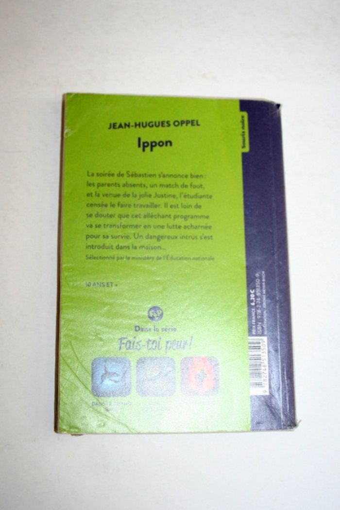 Ippon de Jean-Hugues Oppel, un peu frotté à la tranche malgré la couverture plastique, à partir de 10 ans, 84 pages, 100g La soirée de Sébastien s'annonce bien : les parents absents, un match de foot, et la venue de la jolie Justine, l'étudiante censée le faire travailler. Il est loin de se douter que cet alléchant programme va se transformer en une lutte acharnée pour sa survie. Un dangereux intrus s'est introduit dans la maison...