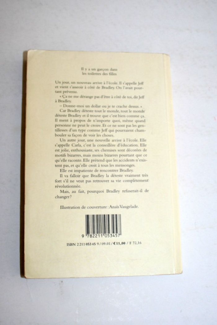 Il y a un garçon dans les toilettes des filles de Louis Sachar, tranche un peu abimé + coins un peu cornés, appartenait à une bibliothèque donc tampon sur la première page + enveloppe collée sur l'intérieur de la dernière de couverture cf photos, valeur 11e, 238 pages, 250g Un jour, un nouveau arrive à l'école. Il s'appelle Jeff et vient s'asseoir à côté de Bradley. On l'avait pourtant prévenu. « - Ca ne me dérange pas d'être à côté de toi, dit Jeff à Bradley. - Donne-moi un dollar ou je te crache dessus. » Car Bradley déteste tout le monde, tout le monde déteste Bradley et il trouve que c'est très bien comme ça. Il ment à propos de n'importe quoi, même quand personne ne peut le croire. Et ce ne sont pas les gentillesses d'un type comme Jeff qui pourraient chambouler sa façon de voir les choses. Un autre jour, une nouvelle arrive à l'école. Elle s'appelle Carla, c'est la conseillère d'éducation. Elle est jolie, enthousiaste, ses chemises sont décorées de motifs bizarres, mais moins bizarres pourtant que ce qu'elle raconte. Elle prétend que les accidents n'existent pas, et qu'elle croit à tous les mensonges. Elle est impatiente de rencontrer Bradley. Il va falloir que Bradley la déteste vraiment très fort s'il ne veut pas retrouver sa vie complètement révolutionnée. Mais, au fait, pourquoi Bradley refuserait-il de changer ?