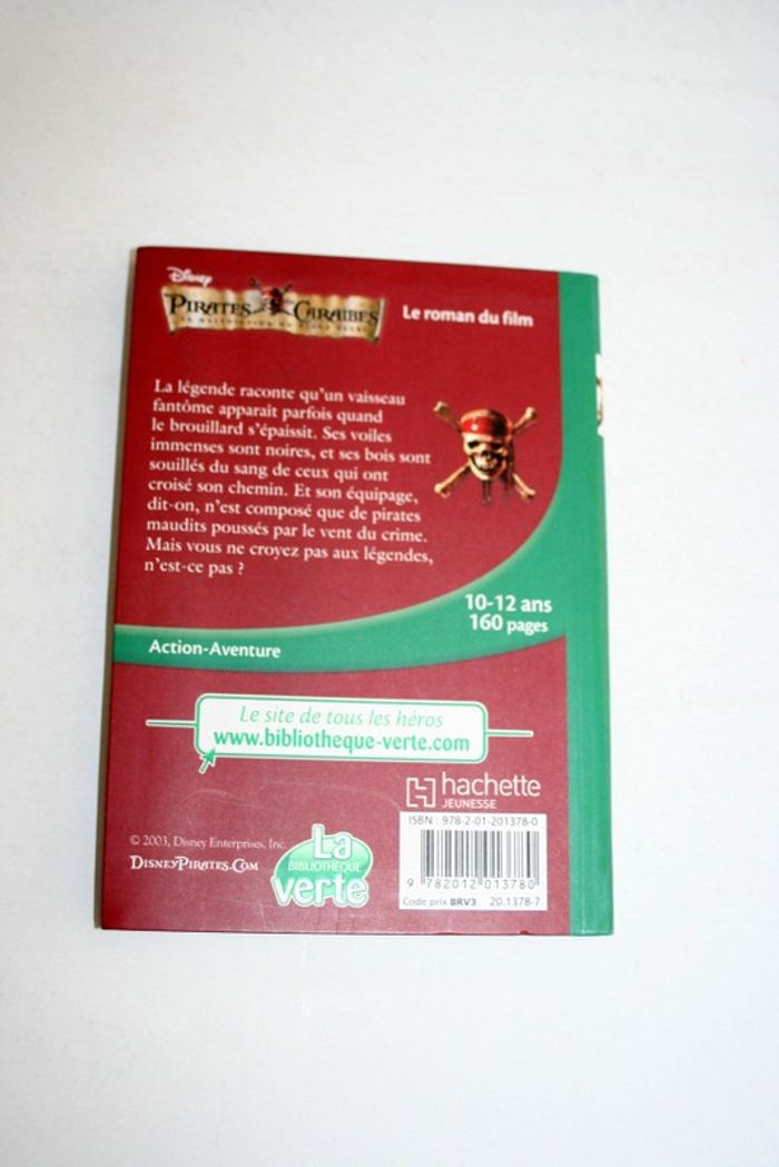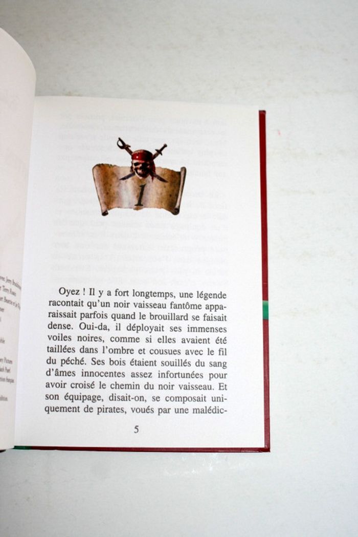 Pirates des Caraïbes, La Malédiction du Black Pearl, Bibliothèque verte, le roman du film, à partir de 10 ans, 160 pages, 200g La légende raconte qu'un vaisseau fantôme apparaît parfois quand le brouillard s'épaissit. Ses voiles immenses sont noires, et ses bois sont souillés du sang de ceux qui ont croisé son chemin. Et son équipage, dit-on, n'est composé que de pirates maudits poussés par le vent du crime. Mais vous ne croyez pas aux légendes, n'est-ce pas ?