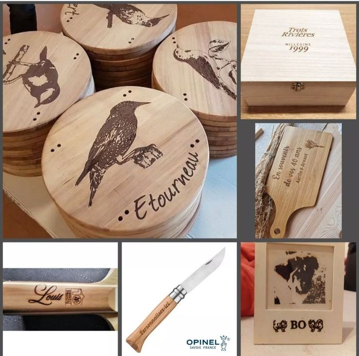 Je propose des gravures personnalisées sur bois et aluminium, réalisées avec soin et passion chez moi, en France. Idéal pour des cadeaux uniques ou pour vous faire plaisir, je peux graver sur de nombreux supports selon vos demandes. Voici quelques exemples de ce que je propose :