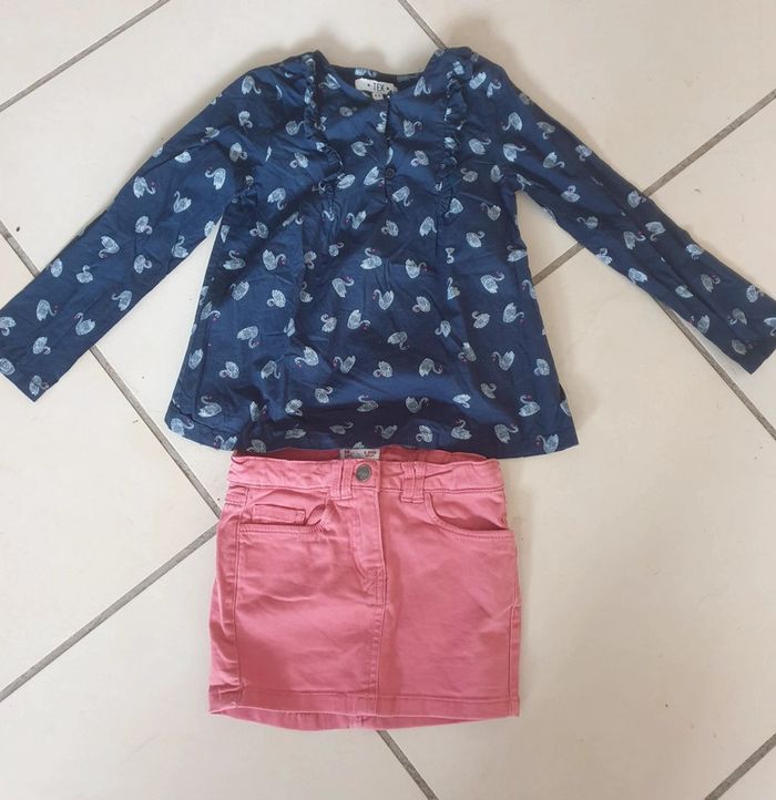 Joli ensemble compose d une blouse de la marque tex taille 4- 5 ans( taille plutôt 5) et une jupe jean de la marque dpam taille 4 ans . Pour voir tout mon 5 ans tapez dans la barre de recherche : #5ansfillelili29217