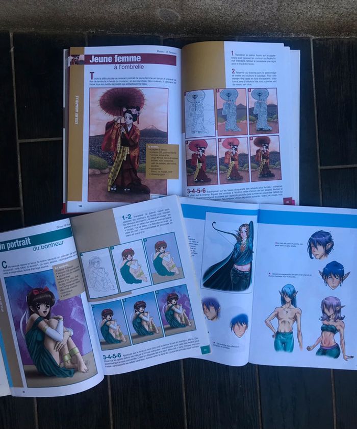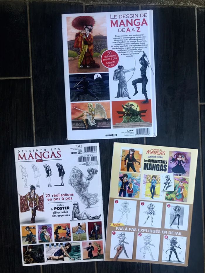 Lot de livres pour apprendre à dessiner les mangas : Livre : Le dessin de mangas de À à Z , les vêtements les proportions, les expressions .. Livre : Spécial Combattants, ninja, sorcière,guerrière Livre : Spécial corps humains et attitudes Ils sont en bon état, malgré qu’ils soient un peu abîmé à certains endroits (voir photos)
