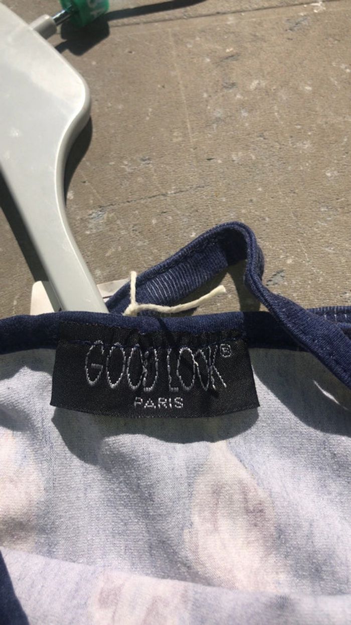 Petite robe d’été bleu marine, avec jolie motif, de la marque Good Look ,pour du 34, en bon état