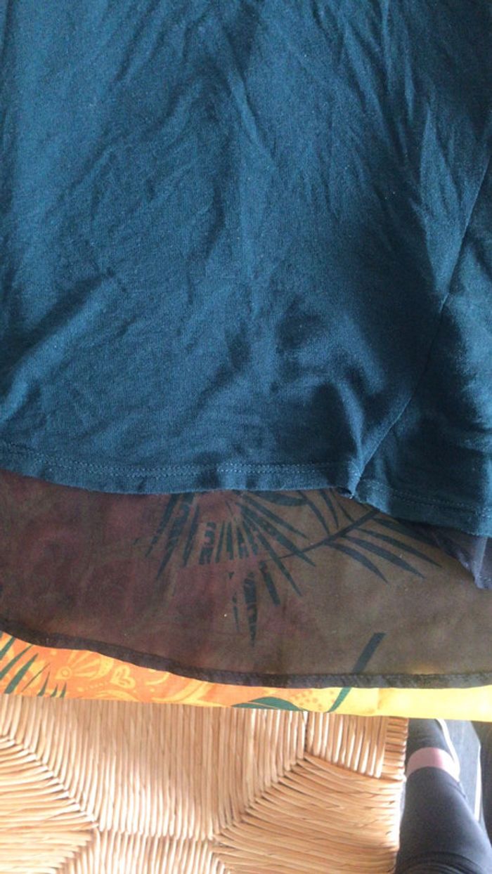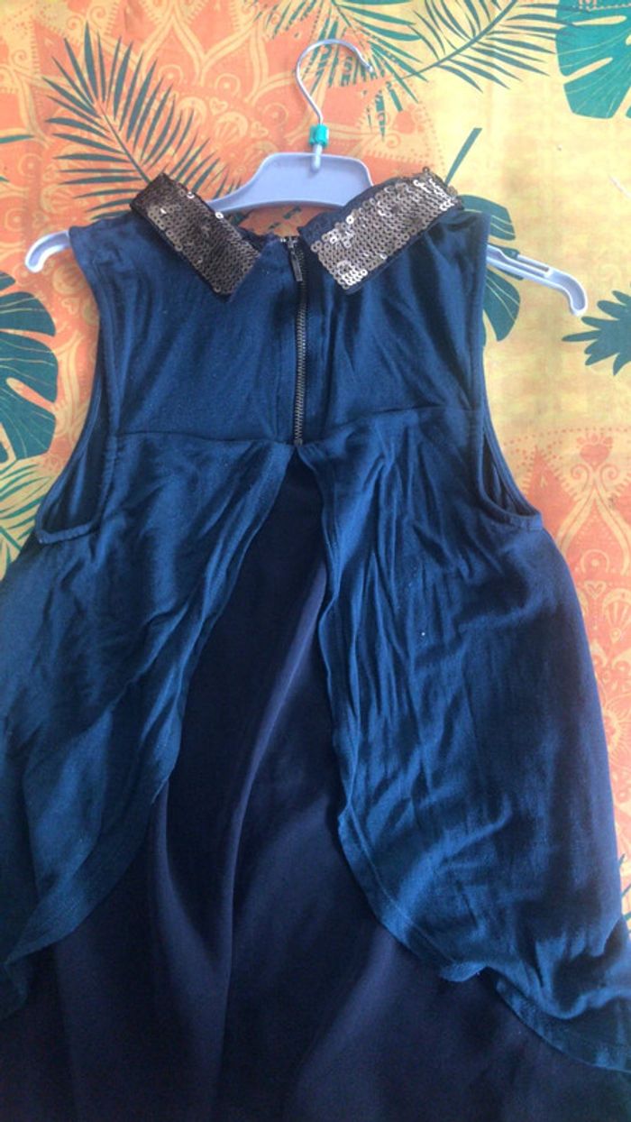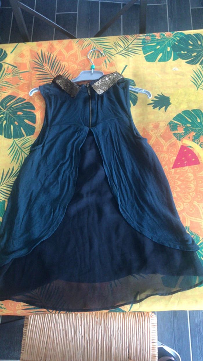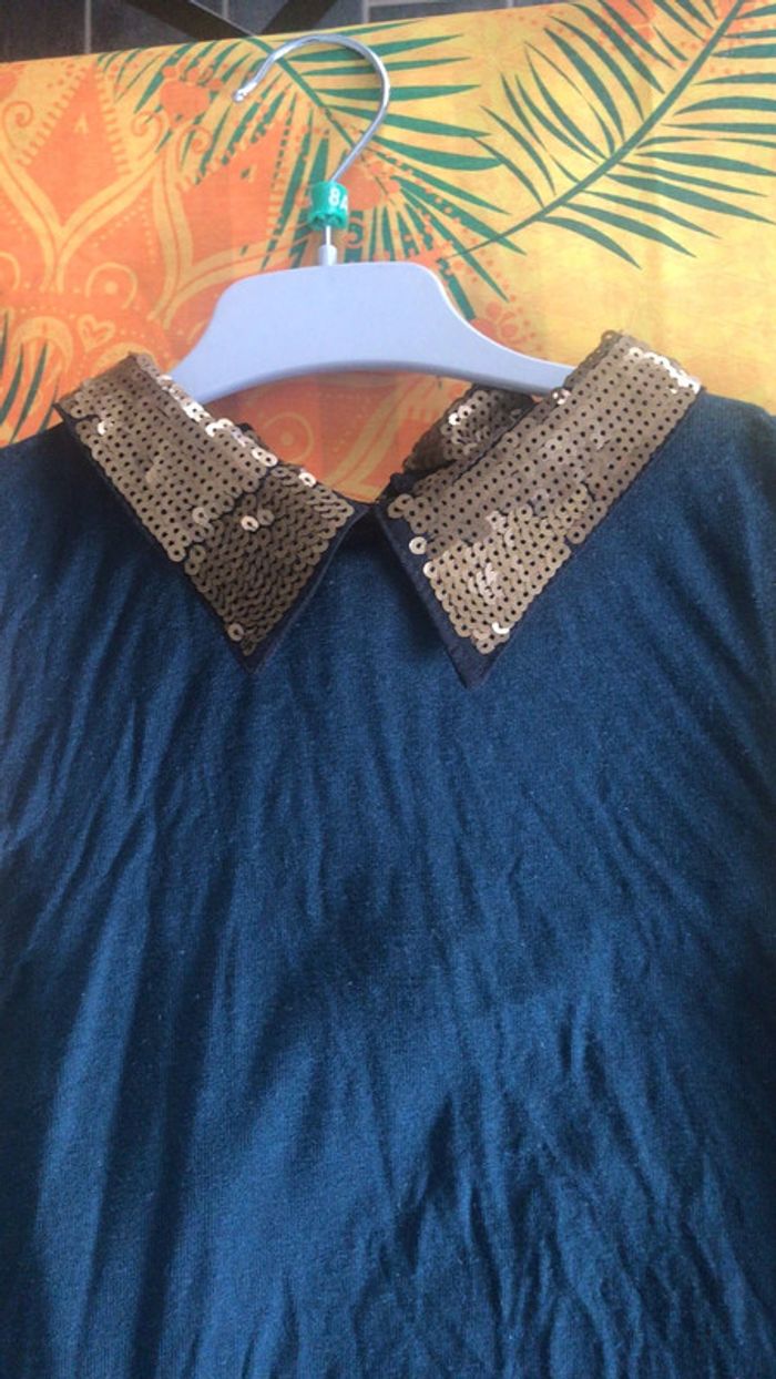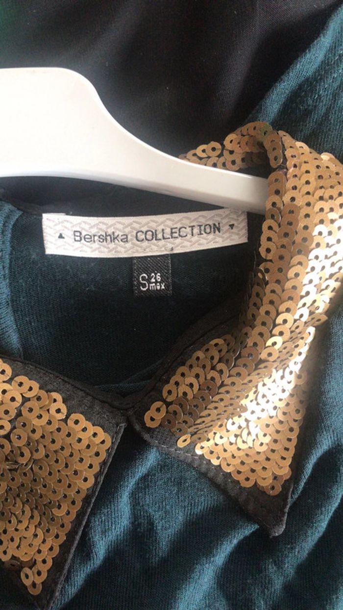 Débardeur avec col effet chemise en paillettes dorés, tissu fluide vert canard avec un tissu transparent noir et une fermeture éclair au dos, de la marque Bershka, pour une taille S , en bon état