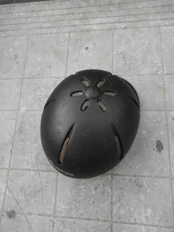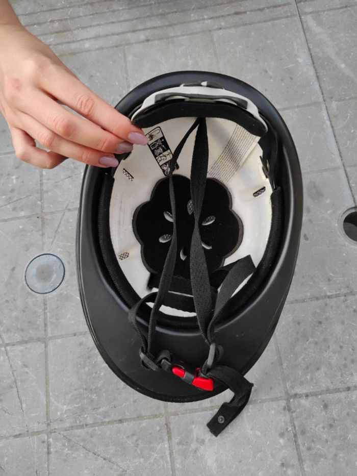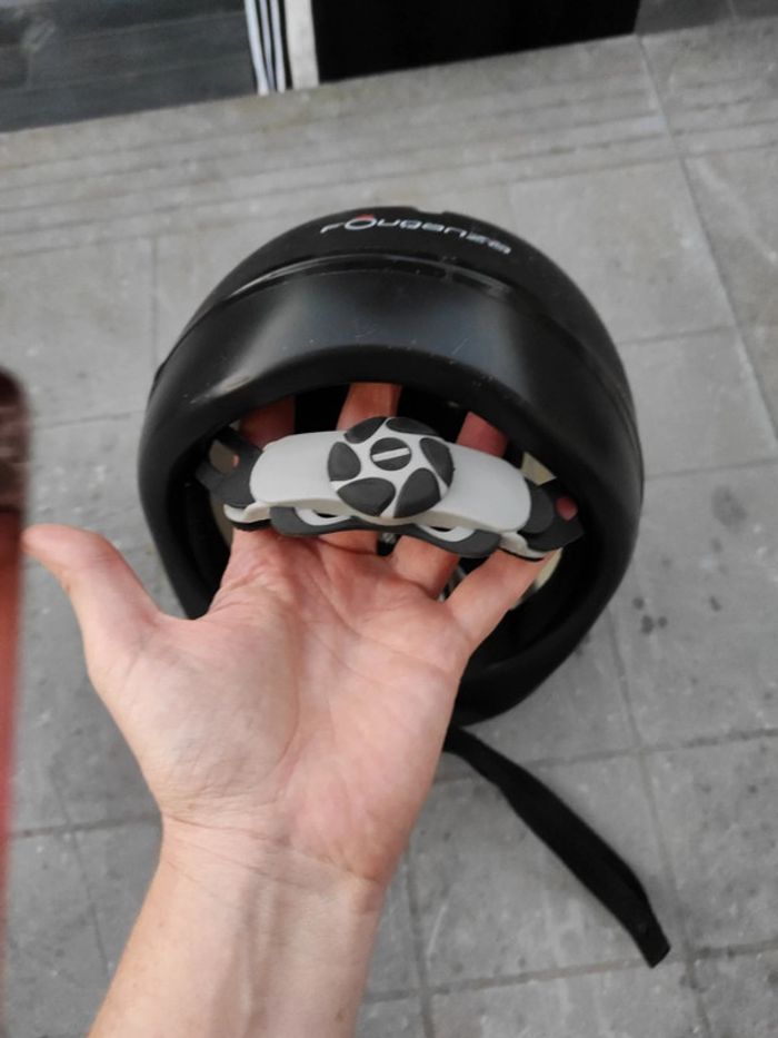 Bombe équitation qui taille 48/52 cm soit un XS Réglable a l'arrière Et rayé sur le dessus mais bombe non abîmé a l'intérieur.