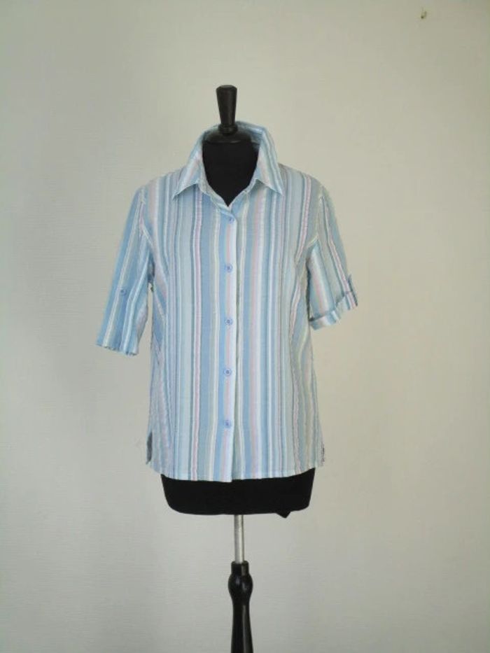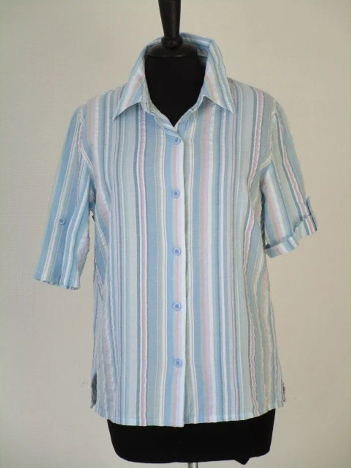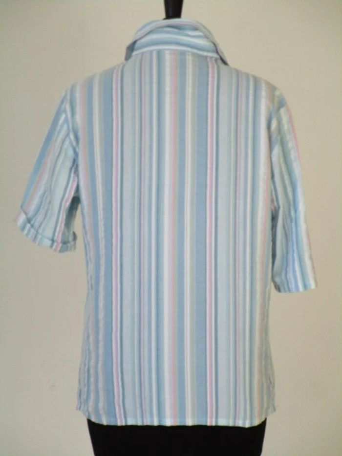 Chemise à rayures vintage Notée taille 44 mais correspond plutôt à du 42 actuel (cf mesures) Bleu ciel/blanc/rose pale/kaki Aspect légèrement gaufré Possibilité de faire un revers sur les manches courtes 100% coton Largeur carrure : 40 cm Largeur aisselle à aisselle : 54 cm Longueur : 64 cm En très bon état #mamanbrade59femme42