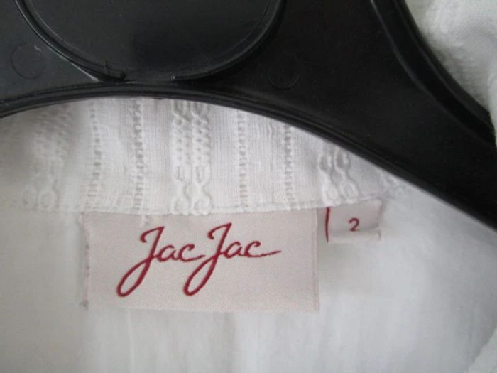 Chemise blanche de marque Jac Jac Taille 2, correspond à du 38 (cf mesures) Coupe cintrée Manches courtes Tissus joliment travaillé Broderies fleurs ton sur ton dans le bas Doublée (sauf aux manches) donc pas transparentes 100% coton Largeur carrure : 39 cm Largeur aisselle à aisselle : 50 cm Longueur : 62 cm En très bon état #mamanbrade59femme38