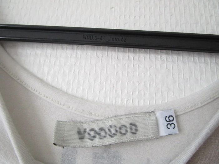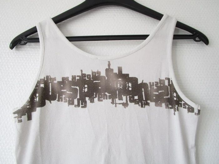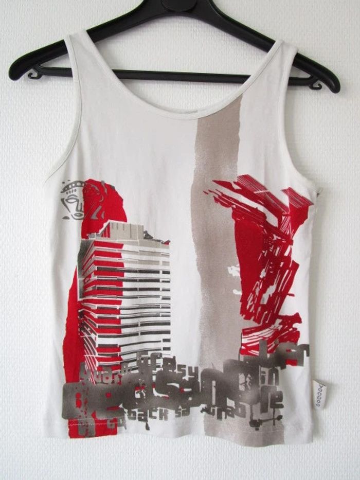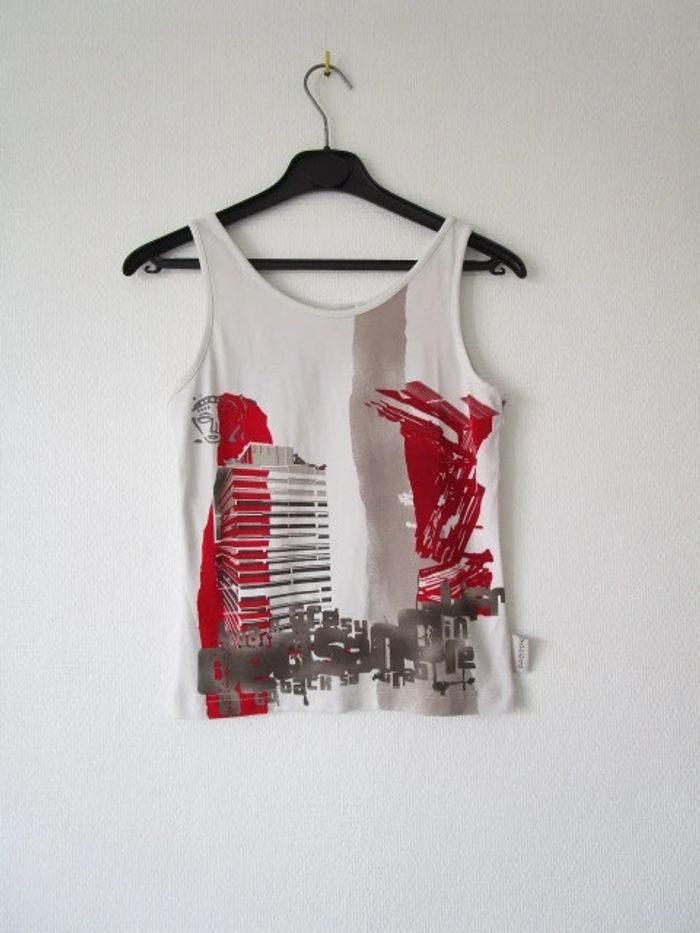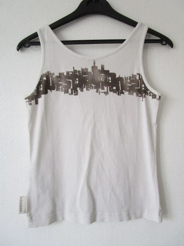 Débardeur de marque Voodoo Indiqué taille 36 mais correspond plutôt à une taille 34 Fond crème imprimé gris et rouge thème city 92% viscose / 2% élasthanne En bon état, porté mais pas de défaut particulier #mamanbrade59femme34