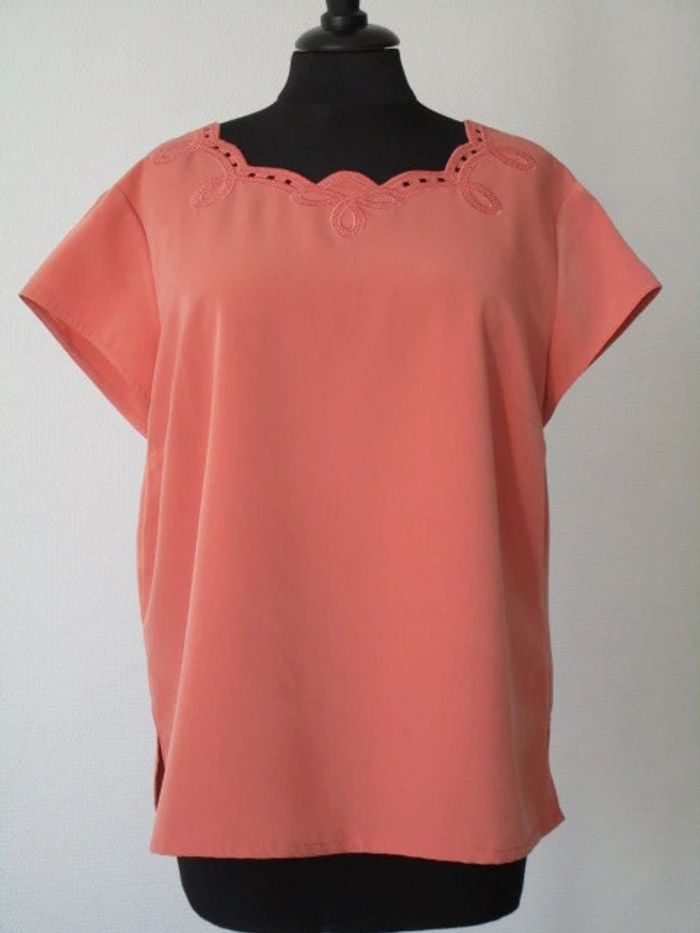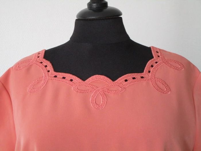 Blouse vintage saumon Pas d'étiquette de taille, correspond à du 44 (cf mesures) Manches courtes Petites fentes sur les côtés Broderies ton sur ton autour du col 100% polyester Largeur carrure : 44 cm Largeur aisselle à aisselle : 56 cm Longueur : 63 cm Etat impeccable #mamanbrade59femme44