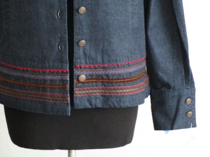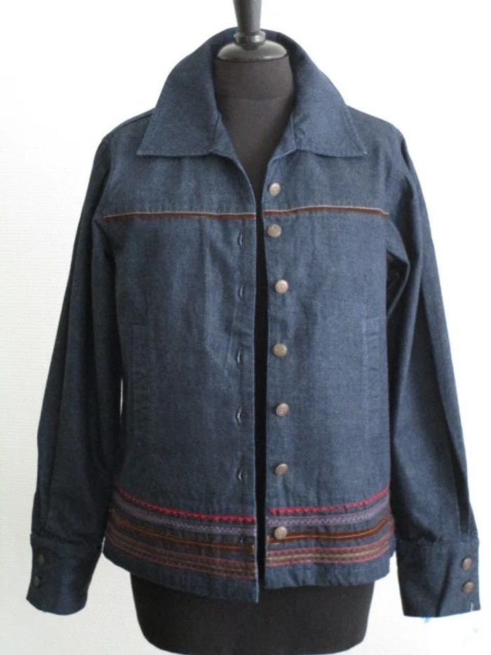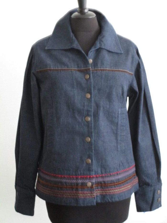 Veste en jean brut de marque Jac Jac taille 2 soit 40 Petite bande velours marron au niveau de la poitrine Plusieurs bandes de différents couleurs dans le bas Poches sur le devant Pas d'étiquette de composition Largeur carrure : 41 cm Largeur aisselle à aisselle : 62 cm NEUVE avec étiquette #mamanbrade59femme40