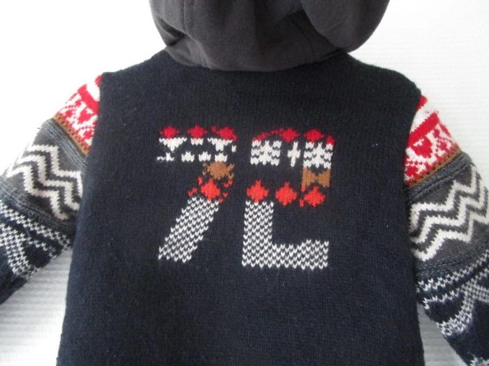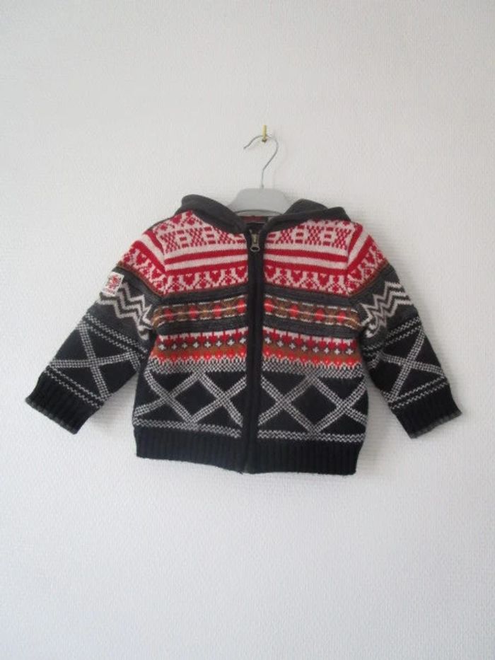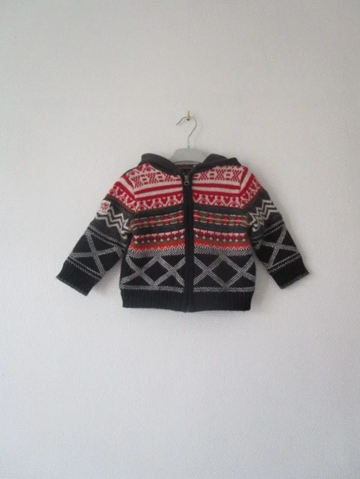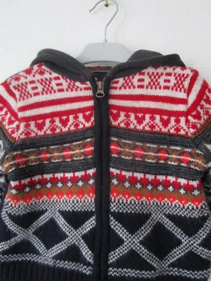 Veste à capuche d'extéieur de marque Catimini taille 2 ans Maille à motifs Capuche matière sweat Bien chaude, entièrement doublée 50% coton/20% polyamide/19% viscose/6% laine/5% autres fibres Doublée 100% coton En très bon état, quelques petites bouloches #mamanbrade59garçon2ans