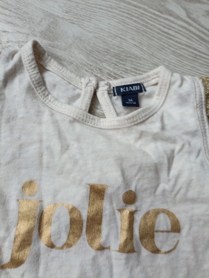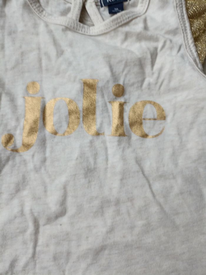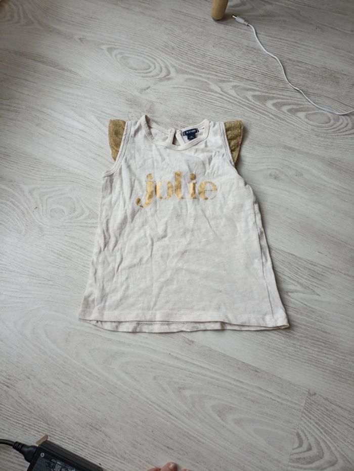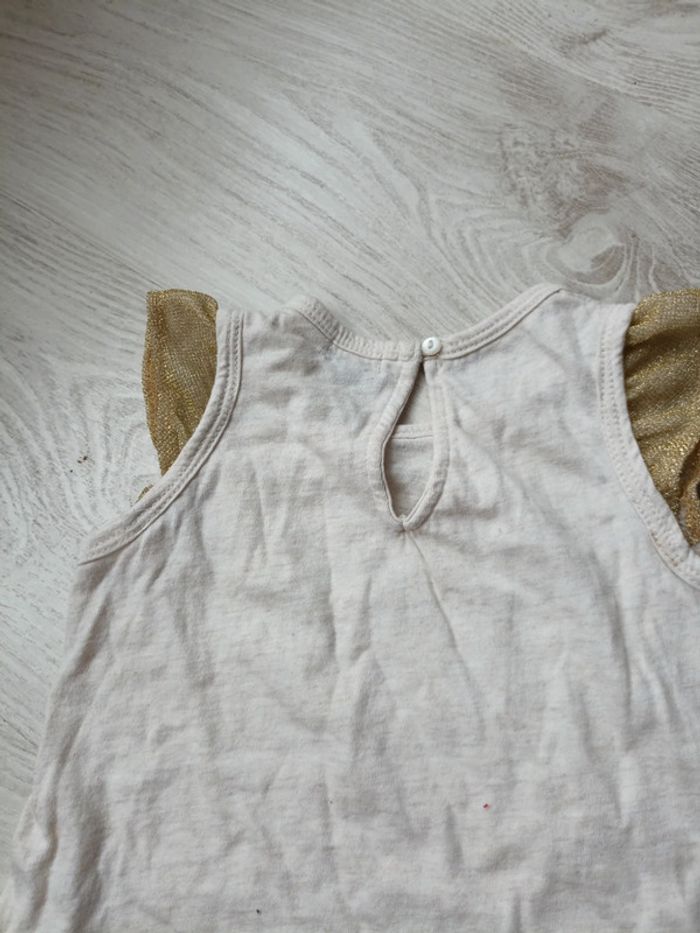 Débardeur beige effet chiné avec volants en tulle dorés sur les épaules Se ferme par un bouton ds le dos #mlledrey523ansfille #mlledrey5236moisfille