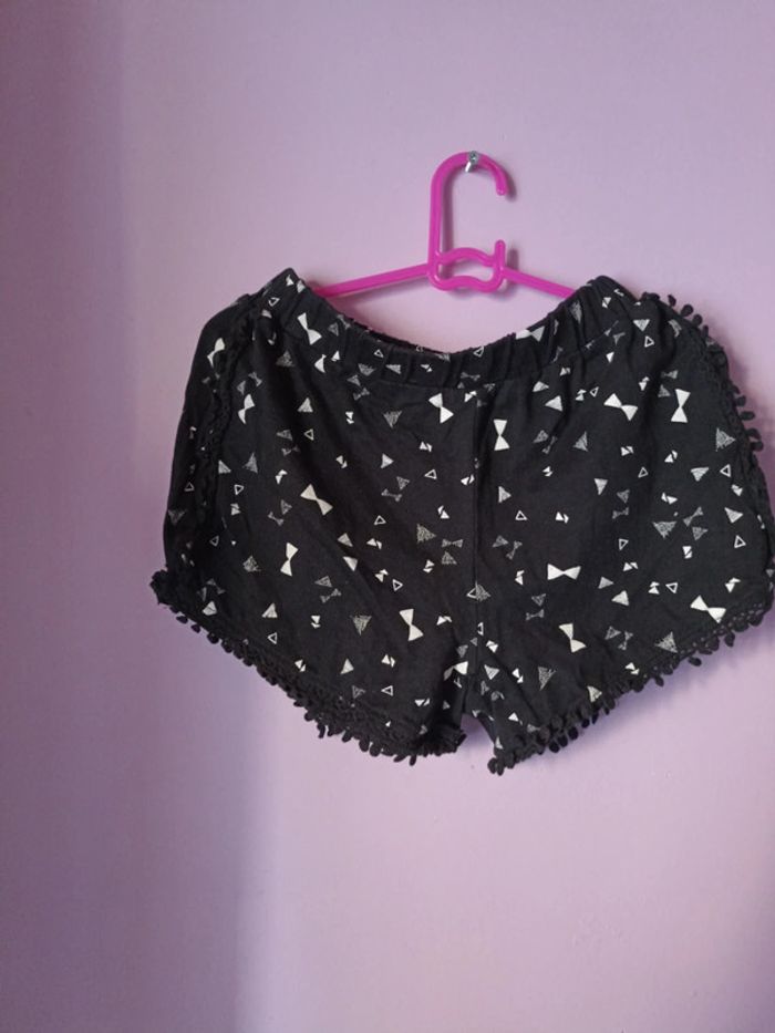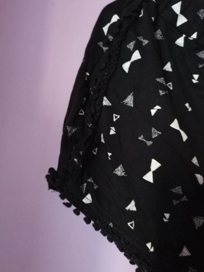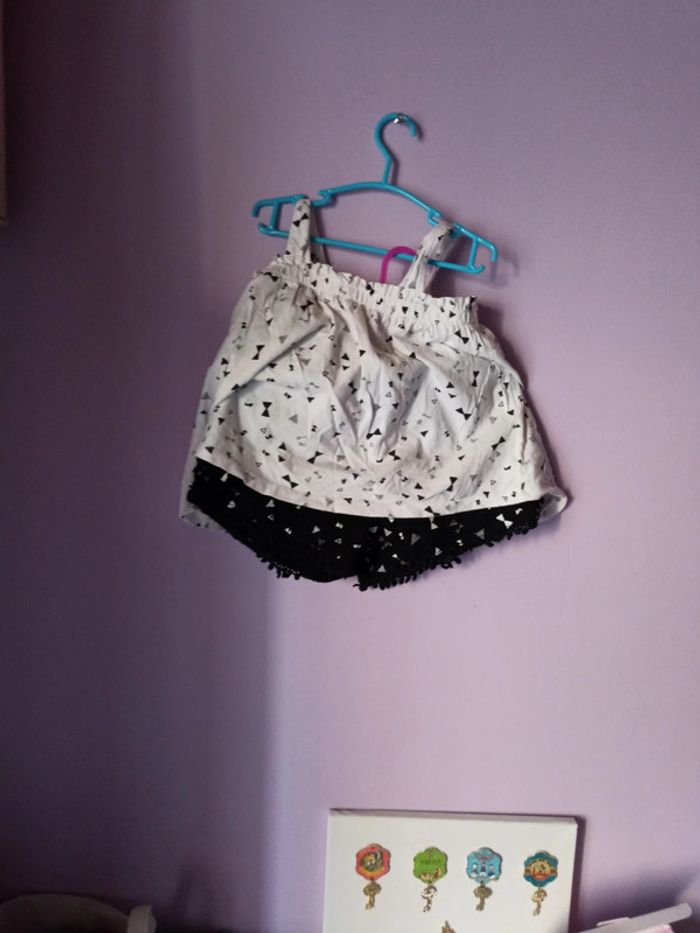 Ensemble composé d un débardeur (plutôt court) blanc avec imprimé et d un short taille élastique noir avec le même imprimé et effet dentelle sur le côté et bas #mlledrey526ansfille