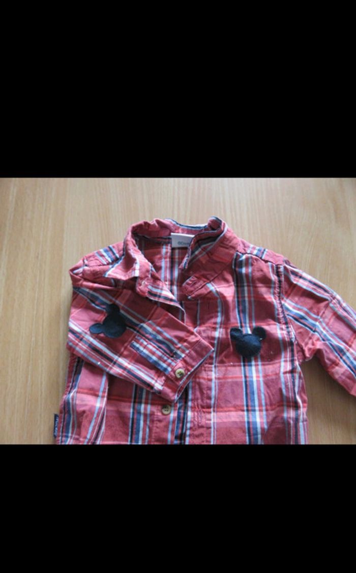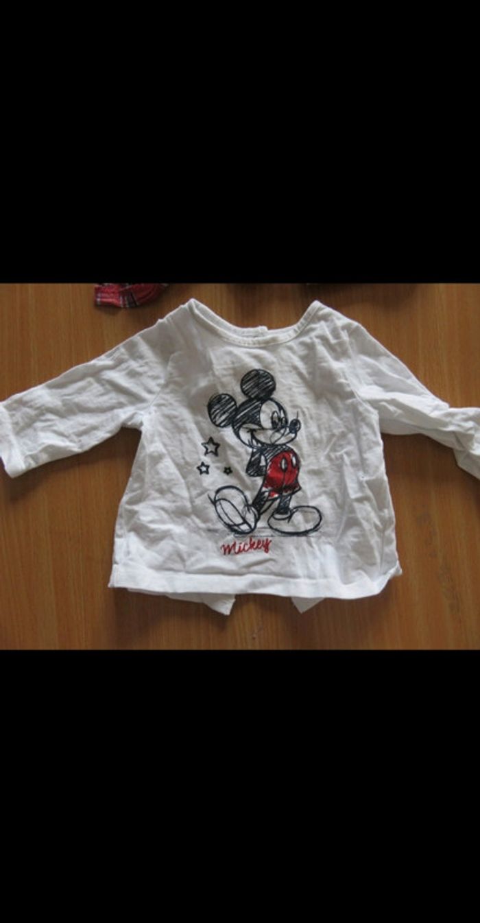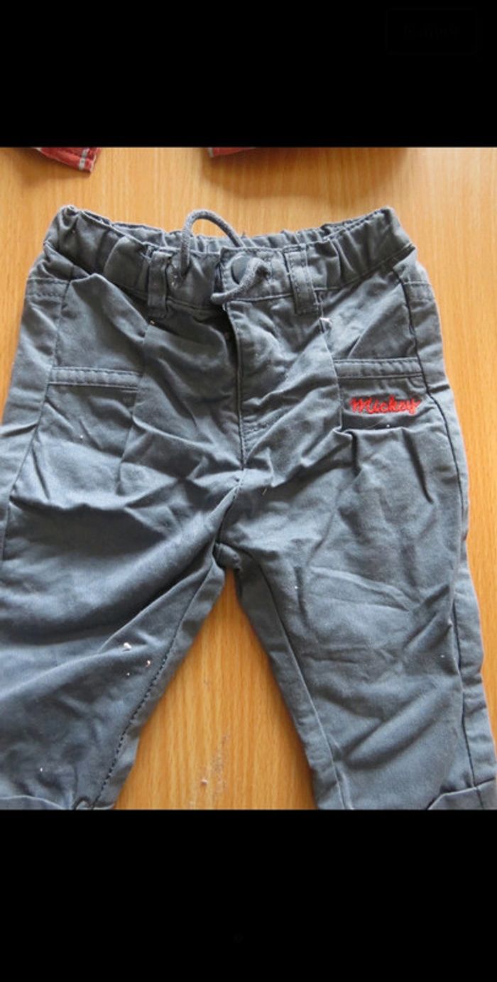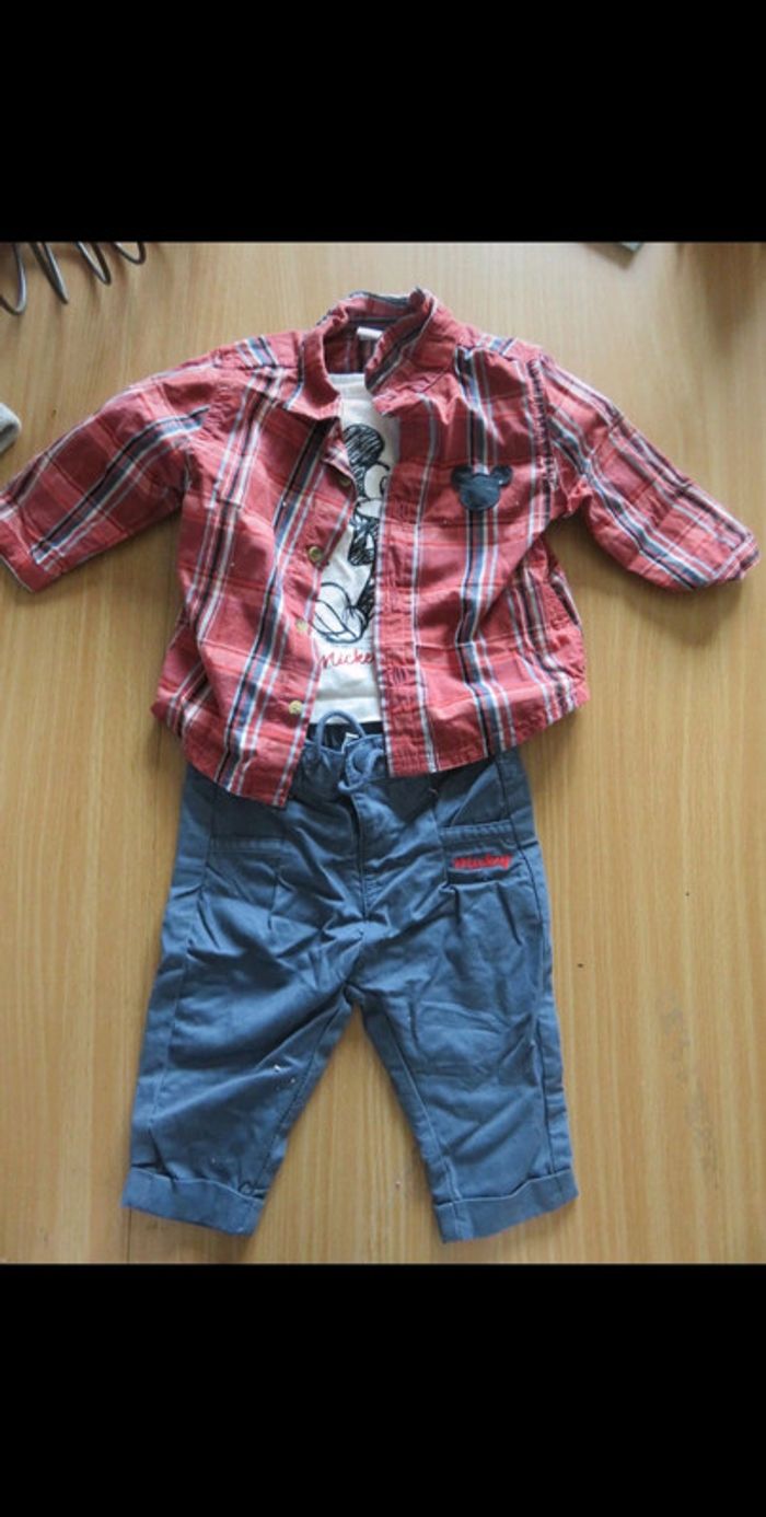 ensemble composé : - d'un pantalon en tissu avec taille réglable . les liens sont décoratifs ils ne permettent pas de resserrer le pantalon - d'un t shirt manches longues entièrement boutonné dans le dos -d'une chemise à carreaux avec empiècement tête de Mickey au niveau des coudes #mlledrey523moisgarçon