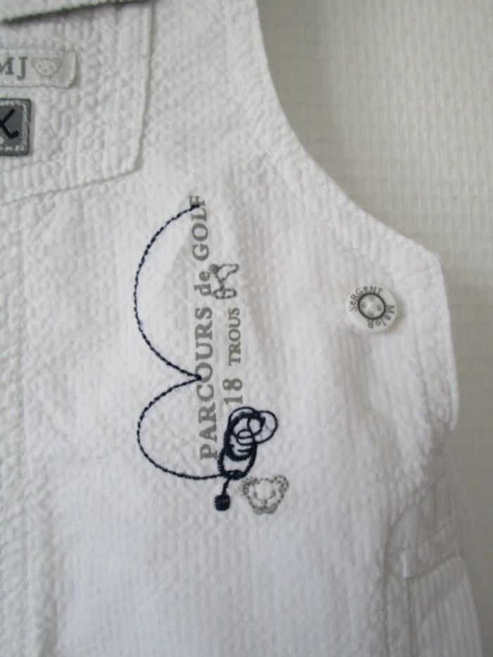 Salopette courte blanche de marque Sergent Major taille 3 mois Tissus en relief, gaufré Thème golf Ouverture par pressions à l'entrejambe Revers dans le bas 100% coton En parfait état, très peu portée #mamanbrade59garçon3mois